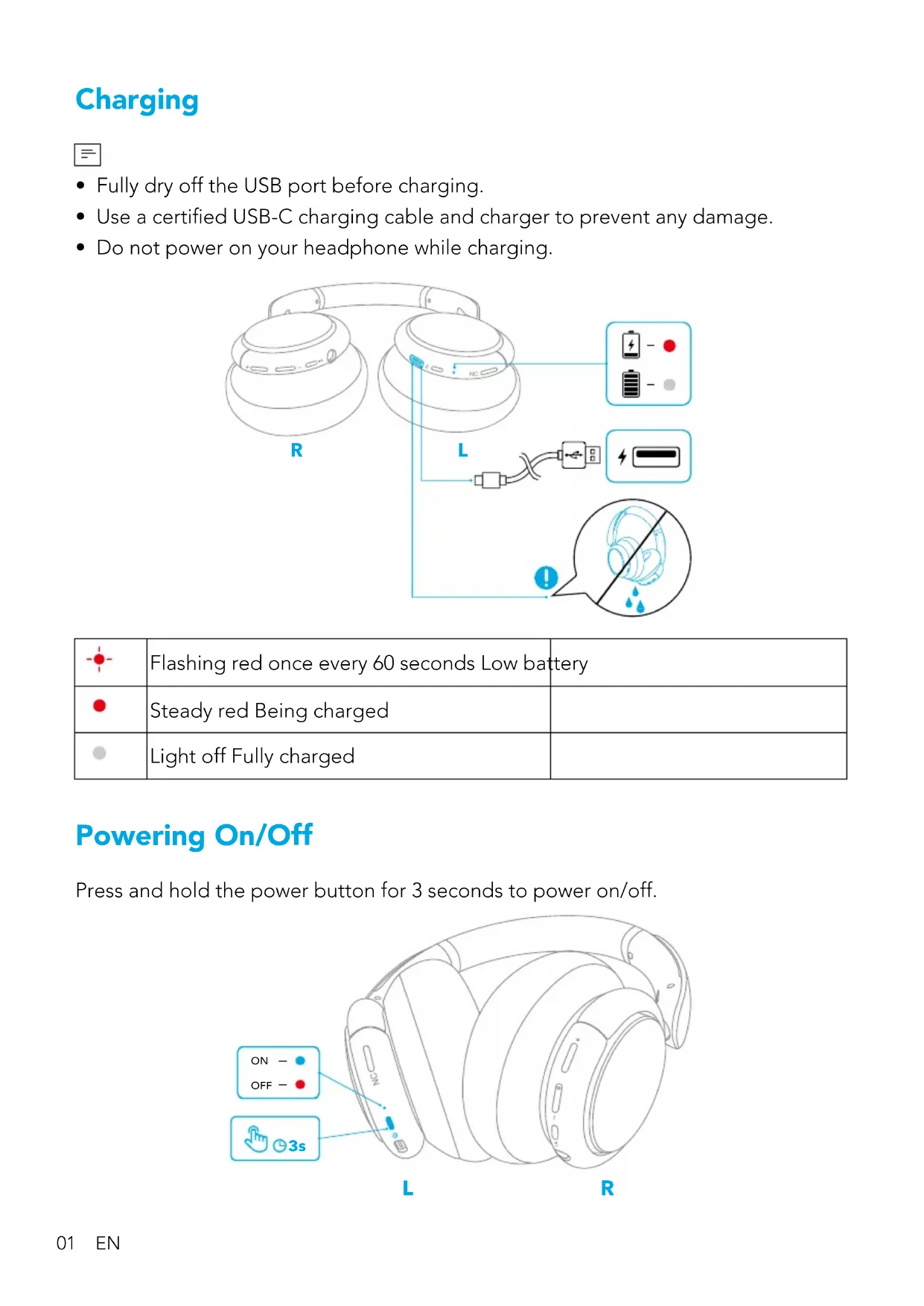 - Do not power on your headphone while charging. R L Flashing red once every 60 seconds Low battery Steady red Being charged Light off Fully charged Powering On/Off Press and hold the power button for 3 seconds to power on/off.