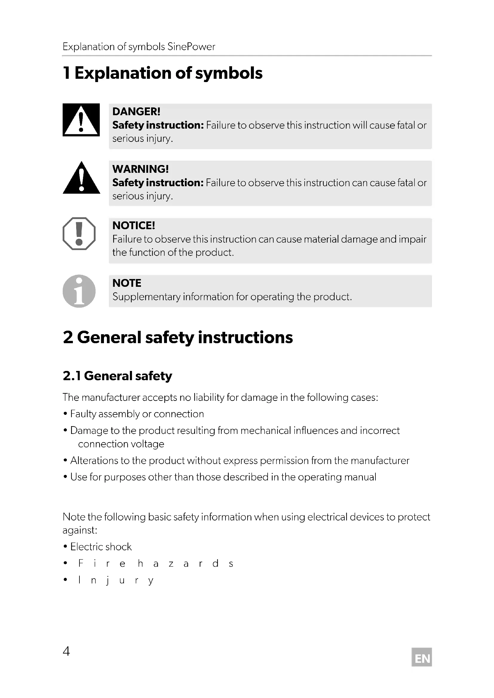 - Injury DANGER! Safety instruction: Failure to observe this instruction will cause fatal or serious injury. WARNING! Safety instruction: Failure to observe this instruction can cause fatal or serious injury. NOTICE! Failure to observe this instruction can cause material damage and impair the function of the product. NOTE Supplementary information for operating the product. DSP600-2000--IO-16s.book Seite 4 Montag, 7. Mai 2018 1:39 13EN SinePower General safety instructions
