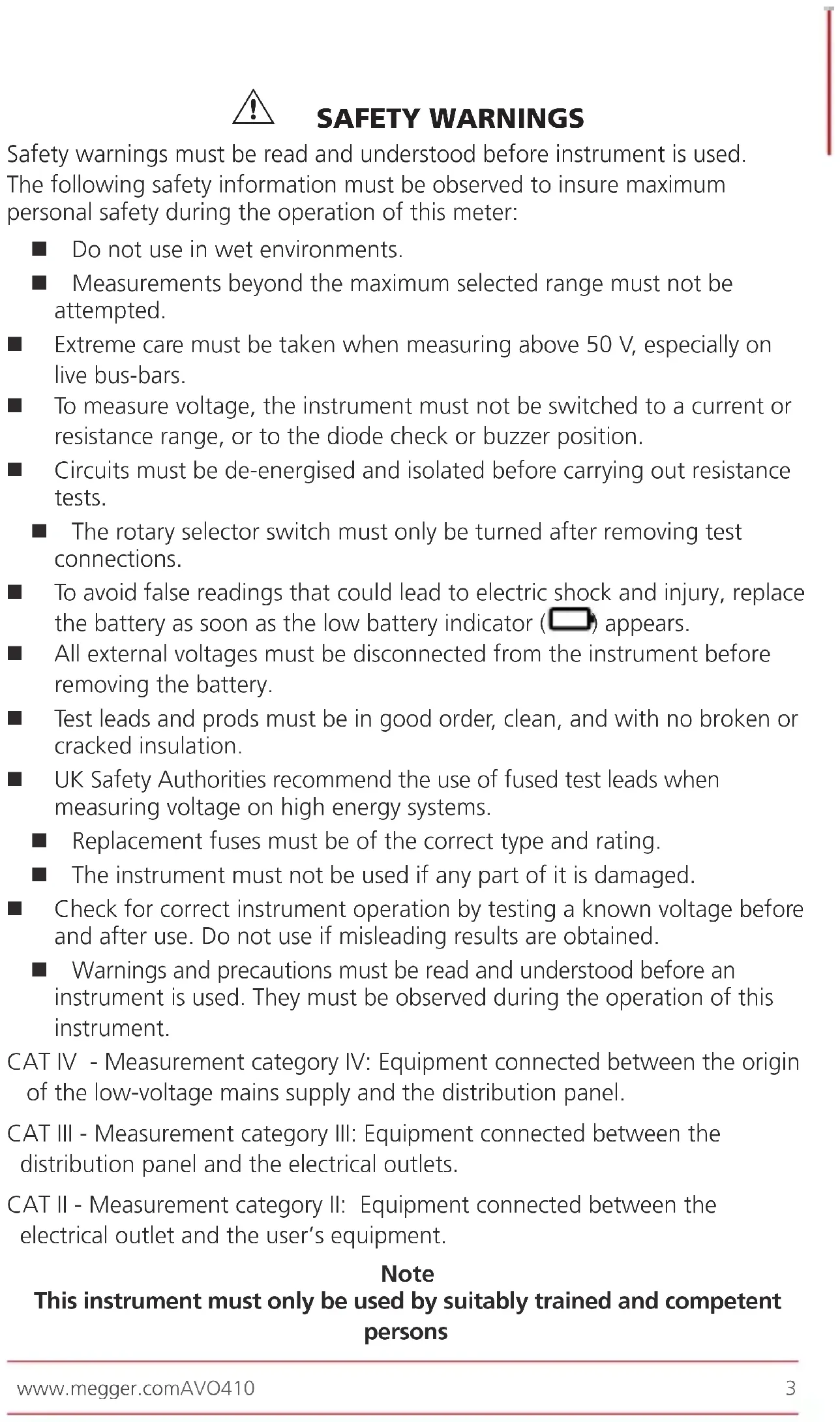 Safety warnings must be read and understood before instrument is used. The following safety information must be observed to insure maximum personal safety during the operation of this meter: n Do not use in wet environments. n Measurements beyond the maximum selected range must not be attempted. n Extreme care must be taken when measuring above 50 V, especially on live bus-bars. n To measure voltage, the instrument must not be switched to a current or resistance range, or to the diode check or buzzer position. n Circuits must be de-energised and isolated before carrying out resistance tests. n The rotary selector switch must only be turned after removing test connections. n To avoid false readings that could lead to electric shock and injury, replace the battery as soon as the low battery indicator ( ) appears. n All external voltages must be disconnected from the instrument before removing the battery. n Test leads and prods must be in good order, clean, and with no broken or cracked insulation. n UK Safety Authorities recommend the use of fused test leads when measuring voltage on high energy systems. n Replacement fuses must be of the correct type and rating. n The instrument must not be used if any part of it is damaged. n Check for correct instrument operation by testing a known voltage before and after use. Do not use if misleading results are obtained. n Warnings and precautions must be read and understood before an instrument is used. They must be observed during the operation of this instrument. CAT IV - Measurement category IV: Equipment connected between the origin of the low-voltage mains supply and the distribution panel. CAT III - Measurement category III: Equipment connected between the distribution panel and the electrical outlets. CAT II - Measurement category II: Equipment connected between the electrical outlet and the user’s equipment. Note This instrument must only be used by suitably trained and competent personswww.megger.com AVO410