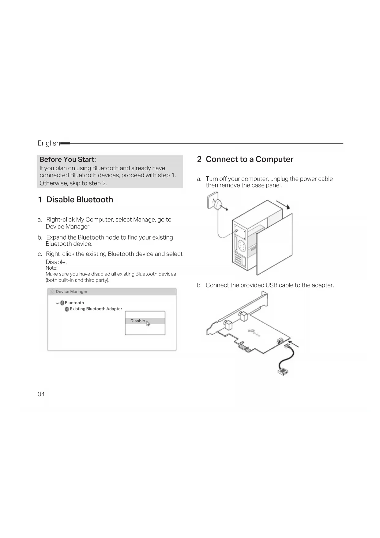 2 Connect to a Computer a. Turn o your computer, unplug the power cable then remove the case panel. b. Connect the provided USB cable to the adapter. 1 Disable Bluetooth a. Right-click My Computer, select Manage, go to Device Manager. b. Expand the Bluetooth node to nd your existing Bluetooth device. c. Right-click the existing Bluetooth device and select Disable. Note: Make sure you have disabled all existing Bluetooth devices (both built-in and third party). Bluetooth Device Manager Disable Existing Bluetooth Adapter Before You Start: If you plan on using Bluetooth and already have connected Bluetooth devices, proceed with step 1. Otherwise, skip to step 2.05 English e. Connect the antenna(s) to the adapter. Note: To maximize performance, make sure the path between the antenna(s) and your router is clear. f. Replace the case panel, plug in the power cable and turn on your computer. 3 Install Drivers a. Insert the CD and run the Autorun.exe. Note: You can also check the new release and download the driver at https://www.tp-link.com/support/download/ b. Install the Wi-Fi and Bluetooth drivers.