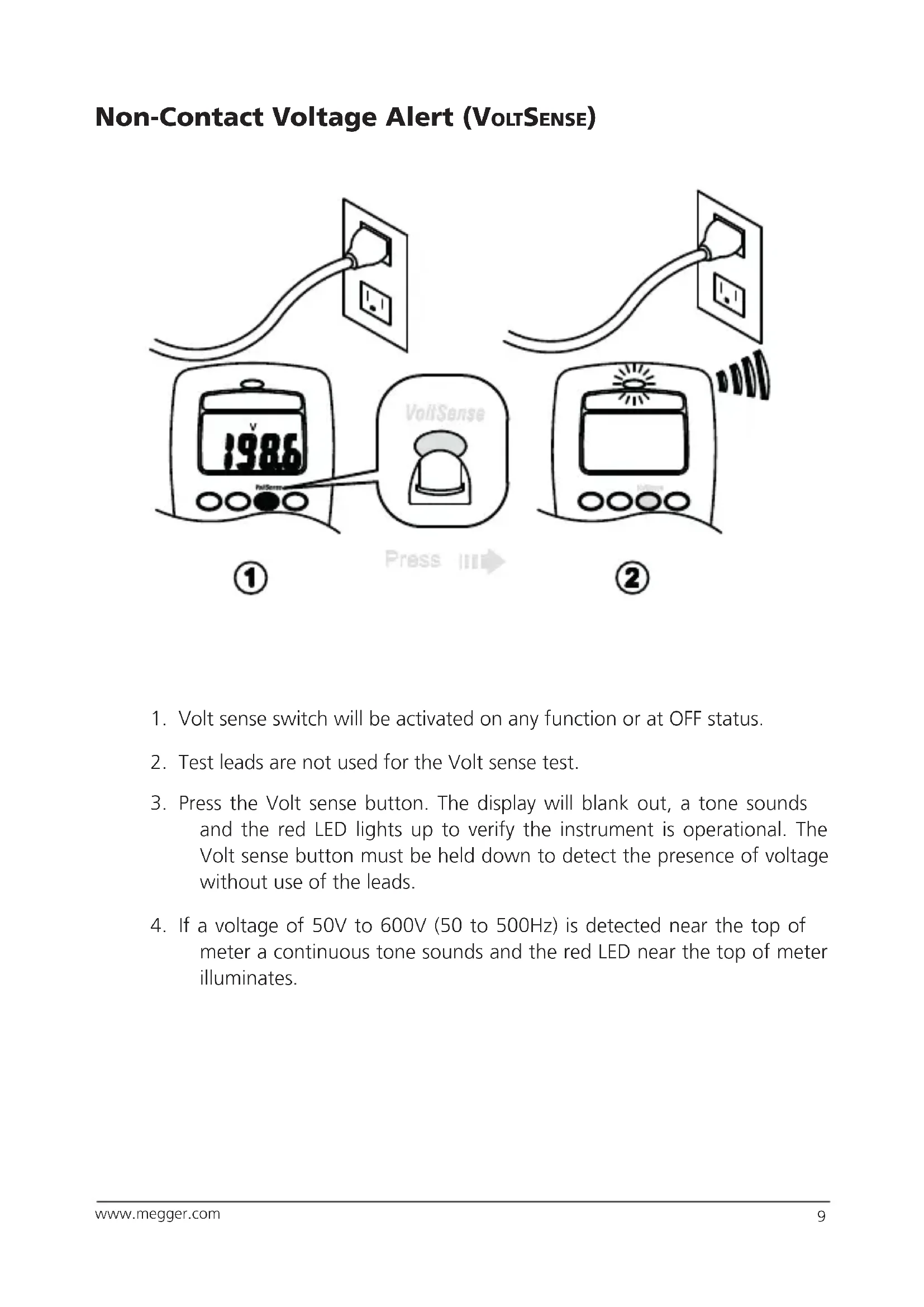 - Press the Volt sense button. The display will blank out, a tone sounds and the red LED lights up to verify the instrument is operational. The Volt sense button must be held down to detect the presence of voltage without use of the leads.