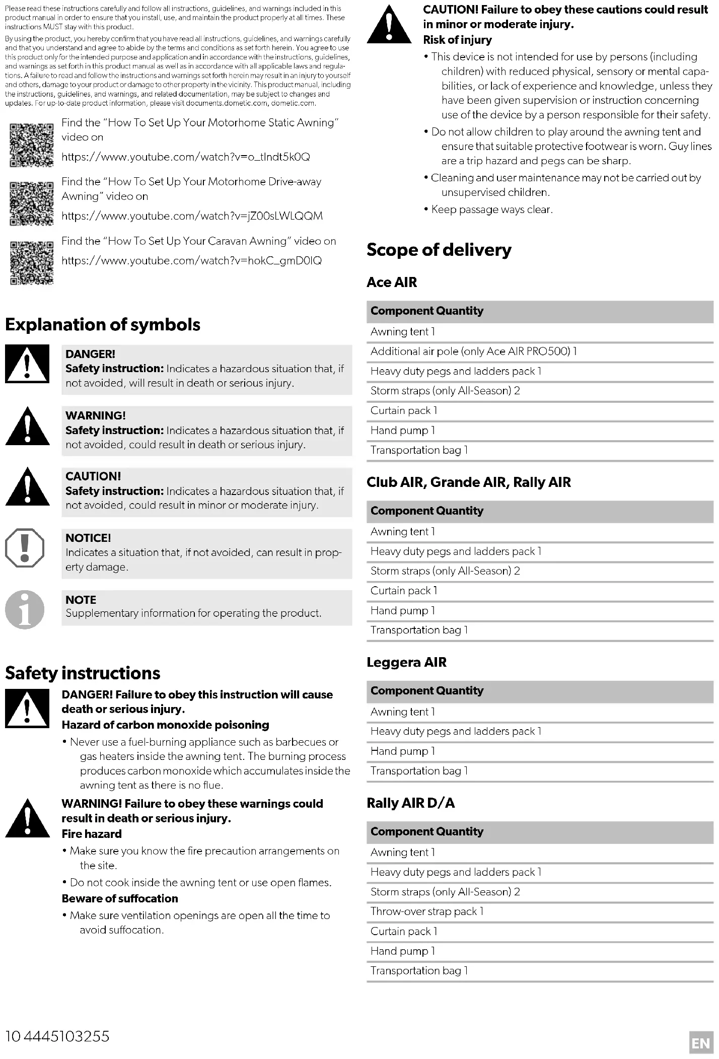 - Keep passage ways clear. Scope of delivery Ace AIR Club AIR, Grande AIR, Rally AIR Leggera AIR Rally AIR D/A Find the “How To Set Up Your Motorhome Static Awning” video on https://www.youtube.com/watch?v=o_tIndt5k0Q Find the “How To Set Up Your Motorhome Drive-away Awning” video on https://www.youtube.com/watch?v=jZ00sLWLQQM Find the “How To Set Up Your Caravan Awning” video on https://www.youtube.com/watch?v=hokC_gmD0lQ DANGER! Safety instruction: Indicates a hazardous situation that, if not avoided, will result in death or serious injury. WARNING! Safety instruction: Indicates a hazardous situation that, if not avoided, could result in death or serious injury. CAUTION! Safety instruction: Indicates a hazardous situation that, if not avoided, could result in minor or moderate injury. NOTICE! Indicates a situation that, if not avoided, can result in prop- erty damage. NOTE Supplementary information for operating the product. Component Quantity Awning tent 1 Additional air pole (only Ace AIR PRO500) 1 Heavy duty pegs and ladders pack 1 Storm straps (only All-Season) 2 Curtain pack 1 Hand pump 1 Transportation bag 1 Component Quantity Awning tent 1 Heavy duty pegs and ladders pack 1 Storm straps (only All-Season) 2 Curtain pack 1 Hand pump 1 Transportation bag 1 Component Quantity Awning tent 1 Heavy duty pegs and ladders pack 1 Hand pump 1 Transportation bag 1 Component Quantity Awning tent 1 Heavy duty pegs and ladders pack 1 Storm straps (only All-Season) 2 Throw-over strap pack 1 Curtain pack 1 Hand pump 1 Transportation bag 1EN