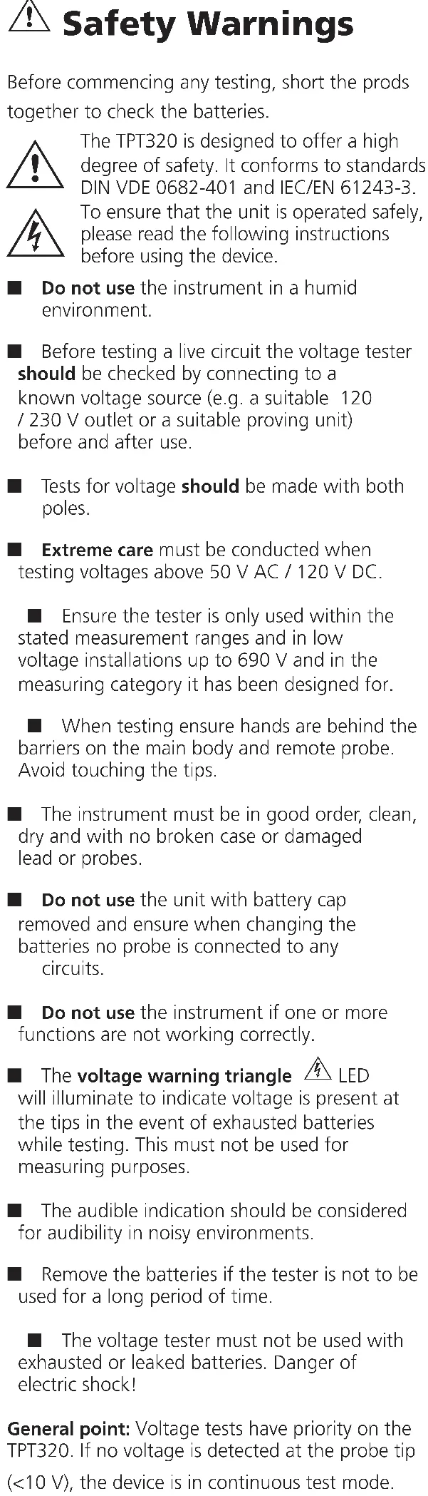 מדריך למשתמשG Safety Warnings Before commencing any testing, short the prods together to check the batteries. The TPT320 is designed to offer a high degree of safety. It conforms to standards DIN VDE 0682-401 and IEC/EN 61243-3. To ensure that the unit is operated safely, please read the following instructions before using the device. ■ Do not use the instrument in a humid environment. ■ Before testing a live circuit the voltage tester should be checked by connecting to a known voltage source (e.g. a suitable 120 / 230 V outlet or a suitable proving unit) before and after use. ■ Tests for voltage should be made with both poles. ■ Extreme care must be conducted when testing voltages above 50 V AC / 120 V DC. ■ Ensure the tester is only used within the stated measurement ranges and in low voltage installations up to 690 V and in the measuring category it has been designed for. ■ When testing ensure hands are behind the barriers on the main body and remote probe. Avoid touching the tips. ■ The instrument must be in good order, clean, dry and with no broken case or damaged lead or probes. ■ Do not use the unit with battery cap removed and ensure when changing the batteries no probe is connected to any circuits. ■ Do not use the instrument if one or more functions are not working correctly. ■ The voltage warning triangle F LED will illuminate to indicate voltage is present at the tips in the event of exhausted batteries while testing. This must not be used for measuring purposes. ■ The audible indication should be considered for audibility in noisy environments. ■ Remove the batteries if the tester is not to be used for a long period of time. ■ The voltage tester must not be used with exhausted or leaked batteries. Danger of electric shock! General point: Voltage tests have priority on the TPT320. If no voltage is detected at the probe tip (<10 V), the device is in continuous test mode.