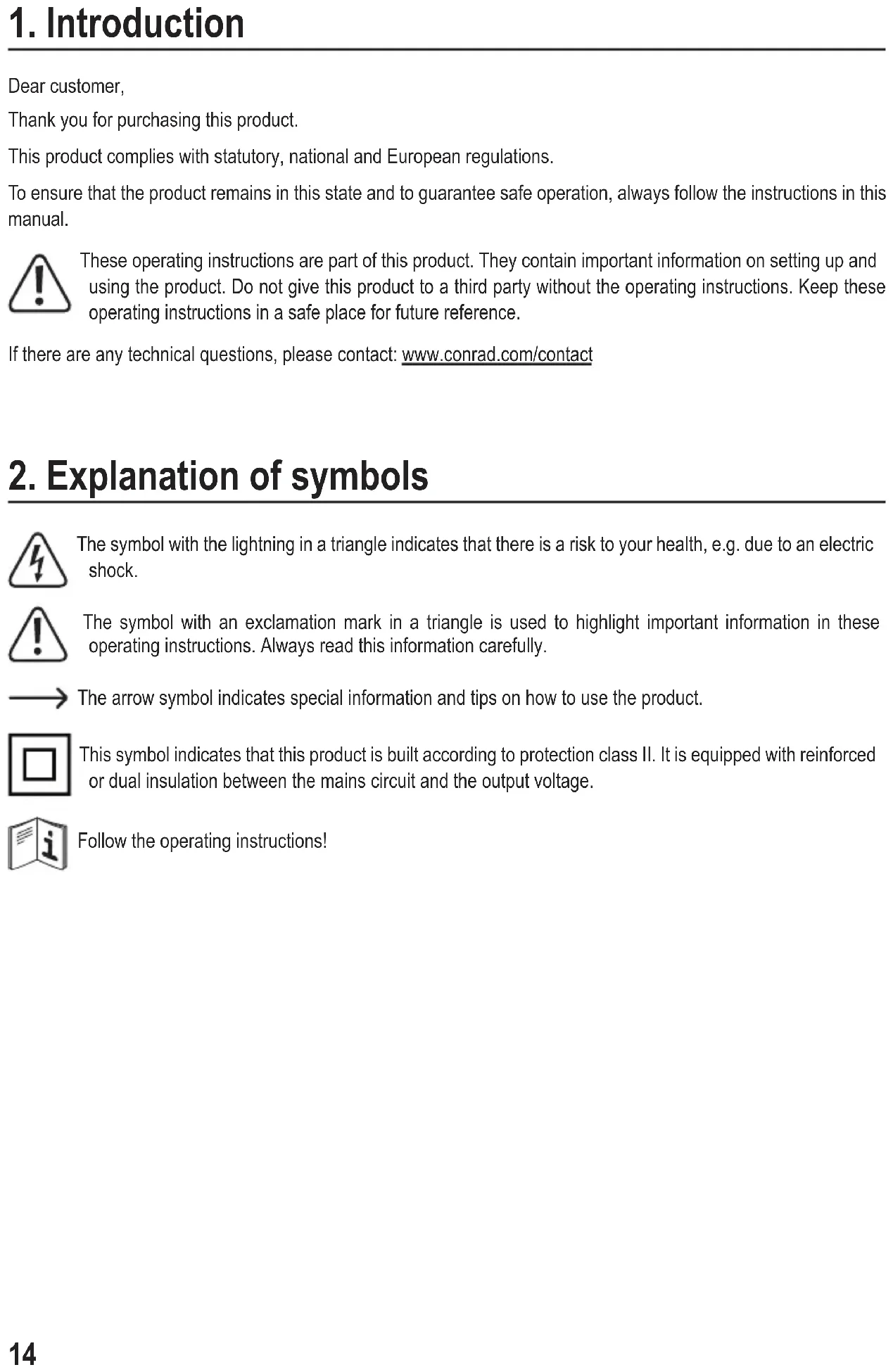 The symbol with the lightning in a triangle indicates that there is a risk to your health, e.g. due to an electric shock. The symbol with an exclamation mark in a triangle is used to highlight important information in these operating instructions. Always read this information carefully. The arrow symbol indicates special information and tips on how to use the product. This symbol indicates that this product is built according to protection class II. It is equipped with reinforced or dual insulation between the mains circuit and the output voltage. Follow the operating instructions!15
