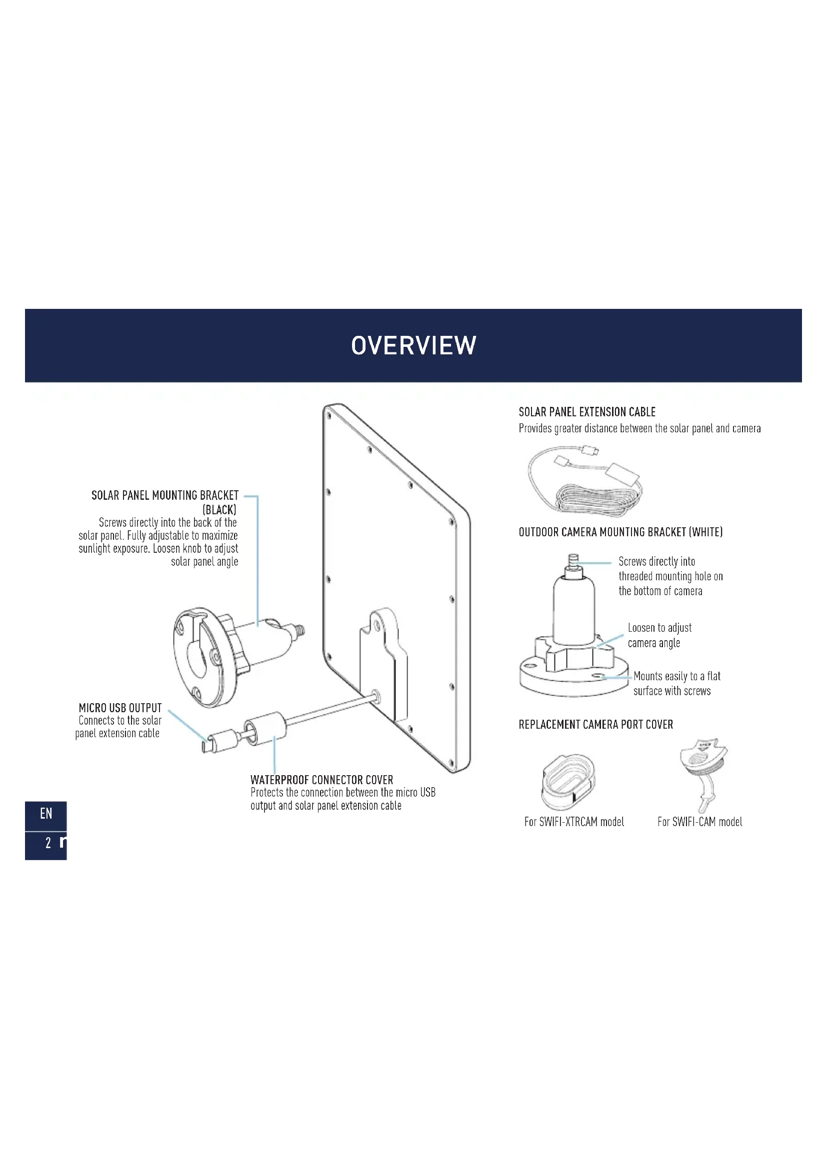 Provides greater distance between the solar panel and camera For SWIFI-CAM model Screws directly into threaded mounting hole on the bottom of camera Loosen to adjust camera angle Mounts easily to a flat surface with screws For SWIFI-XTRCAM model3