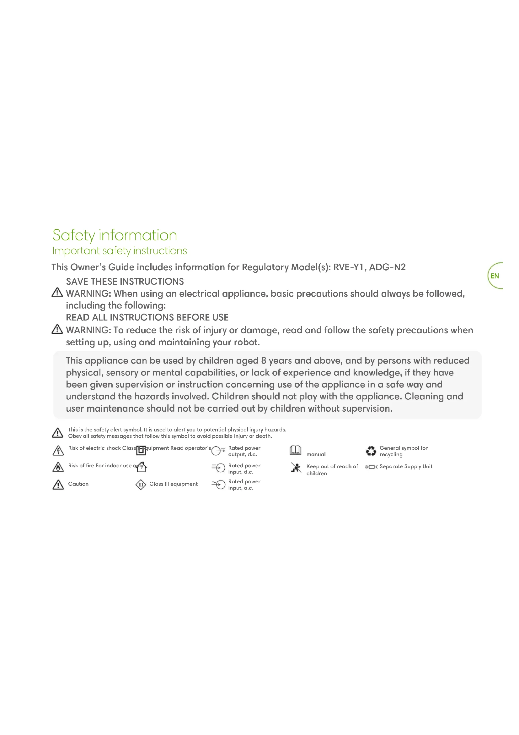 Risk of electric shock Class II equipment Read operator’s manual Risk of fire For indoor use only Keep out of reach of children General symbol for recycling Rated power input, d.c. Rated power output, d.c. Separate Supply Unit This Owner’s Guide includes information for Regulatory Model(s): RVE-Y1, ADG-N2 Caution Rated power input, a.c. Class III equipmentEN