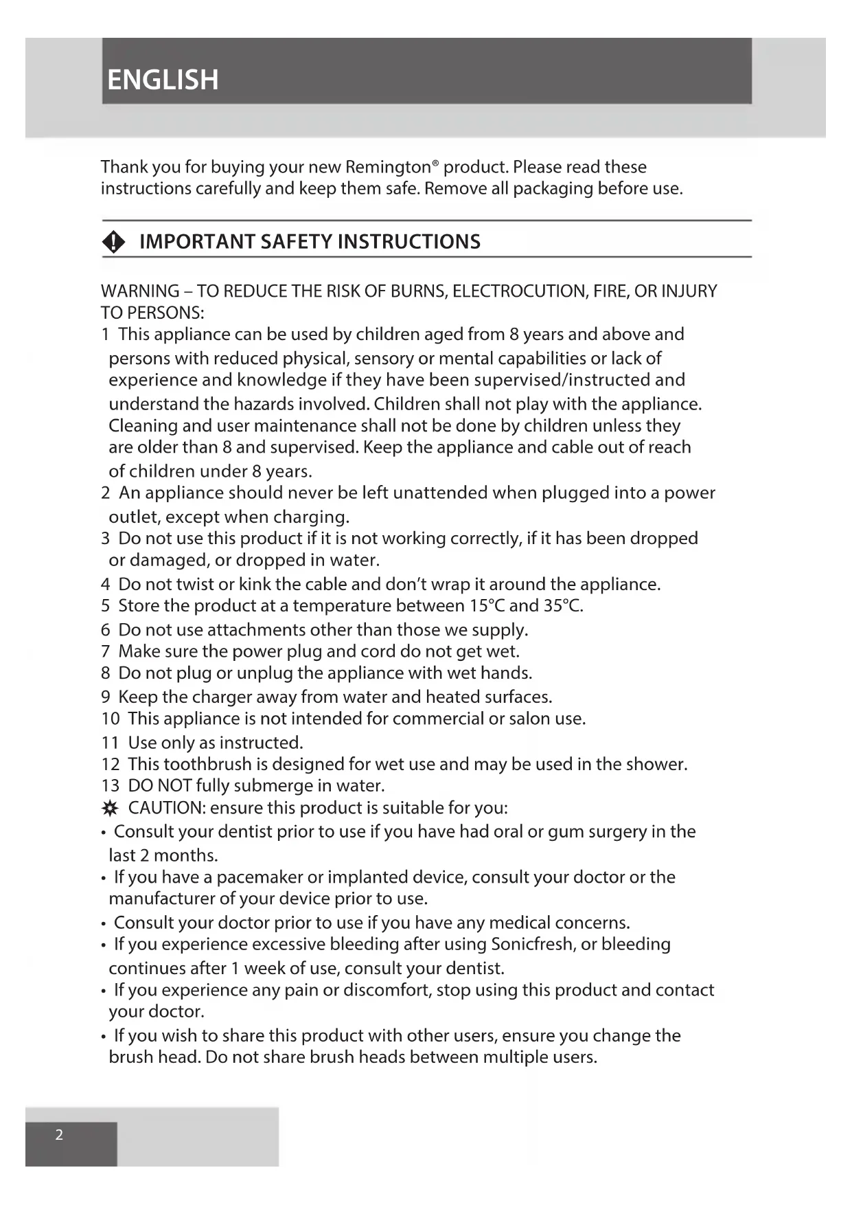 WARNING – TO REDUCE THE RISK OF BURNS, ELECTROCUTION, FIRE, OR INJURY TO PERSONS: 1 This appliance can be used by children aged from 8 years and above and persons with reduced physical, sensory or mental capabilities or lack of experience and knowledge if they have been supervised/instructed and understand the hazards involved. Children shall not play with the appliance. Cleaning and user maintenance shall not be done by children unless they are older than 8 and supervised. Keep the appliance and cable out of reach of children under 8 years. 2 An appliance should never be left unattended when plugged into a power outlet, except when charging. 3 Do not use this product if it is not working correctly, if it has been dropped or damaged, or dropped in water. 4 Do not twist or kink the cable and don’t wrap it around the appliance. 5 Store the product at a temperature between 15°C and 35°C. 6 Do not use attachments other than those we supply. 7 Make sure the power plug and cord do not get wet. 8 Do not plug or unplug the appliance with wet hands. 9 Keep the charger away from water and heated surfaces. 10 This appliance is not intended for commercial or salon use. 11 Use only as instructed. 12 This toothbrush is designed for wet use and may be used in the shower. 13 DO NOT fully submerge in water. , CAUTION: ensure this product is suitable for you: