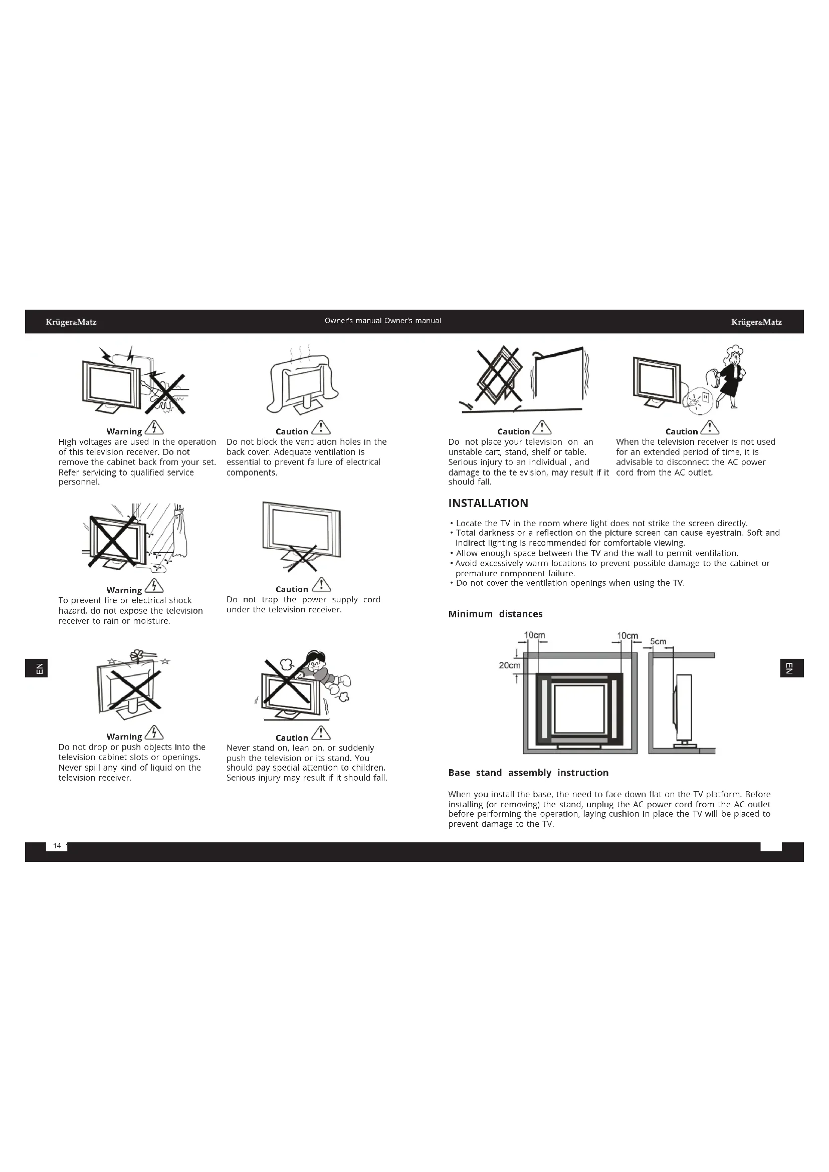 - Do not cover the ventilation openings when using the TV. Minimum distances Base stand assembly instruction When you install the base, the need to face down flat on the TV platform. Before installing (or removing) the stand, unplug the AC power cord from the AC outlet before performing the operation, laying cushion in place the TV will be placed to prevent damage to the TV.16 17 Owner’s manual Owner’s manual