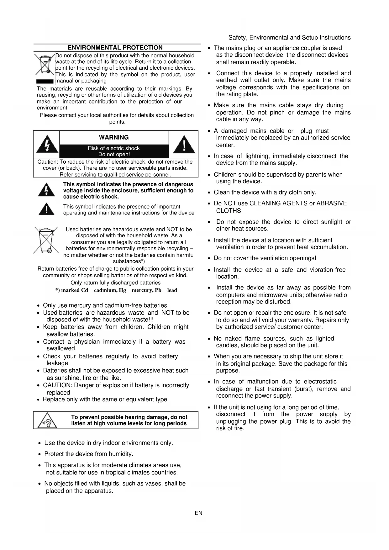 Only use mercury and cadmium-free batteries. Used batteries are hazardous waste and NOT to be disposed of with the household waste!!! Keep batteries away from children. Children might swallow batteries. Contact a physician immediately if a battery was swallowed. Check your batteries regularly to avoid battery leakage. Batteries shall not be exposed to excessive heat such as sunshine, fire or the like. CAUTION: Danger of explosion if battery is incorrectly replaced Replace only with the same or equivalent type