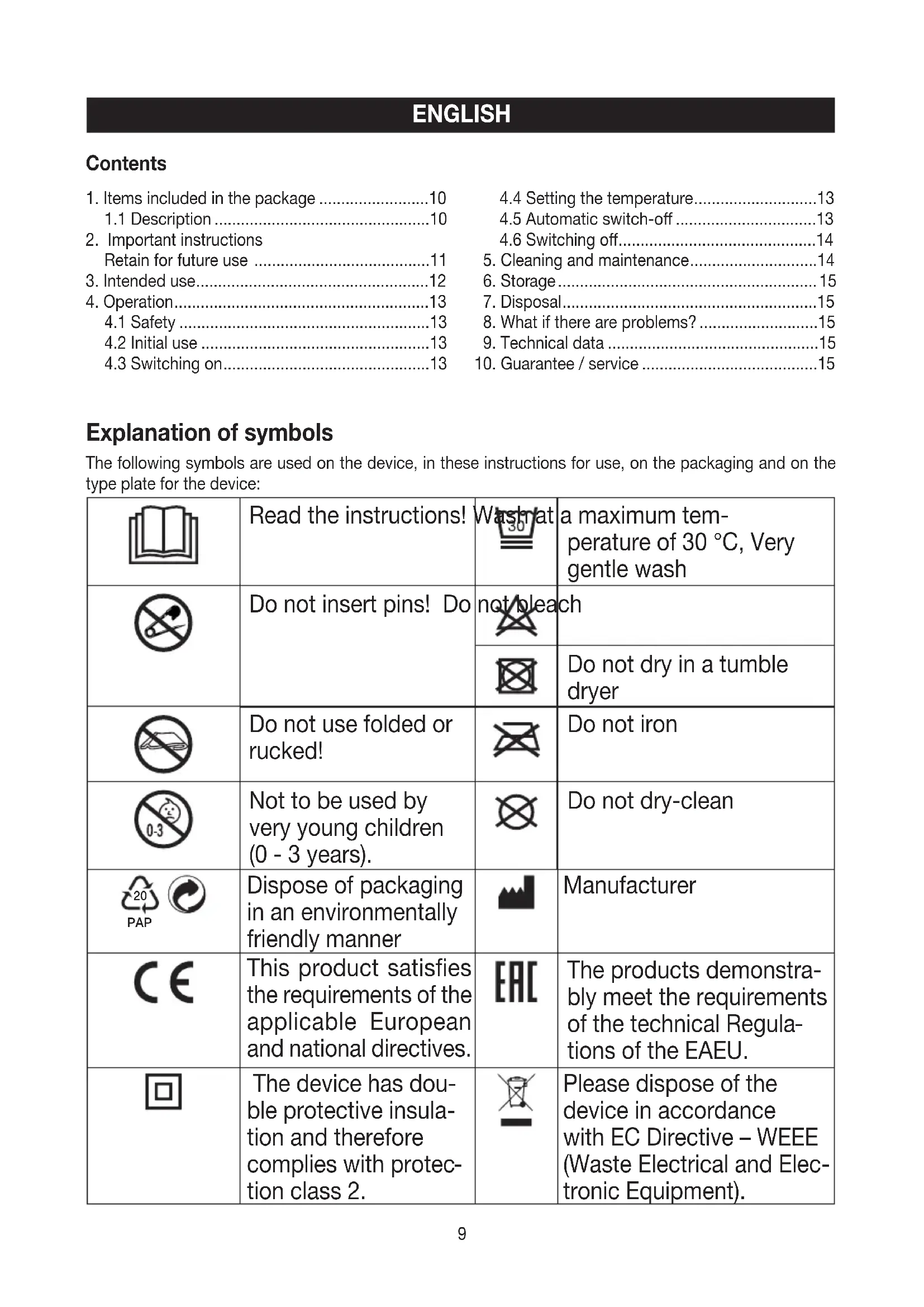 Check that the exterior of the cardboard delivery packaging is intact and make sure that all contents are present. Before use, ensure that there is no visible damage to the device or accessories and that all packag- ing material has been removed. If you have any doubts, do not use the device and contact your retailer or the specified Customer Service address. 1 Heat pad 1 Cover 1 Control 1 Instructions for use
