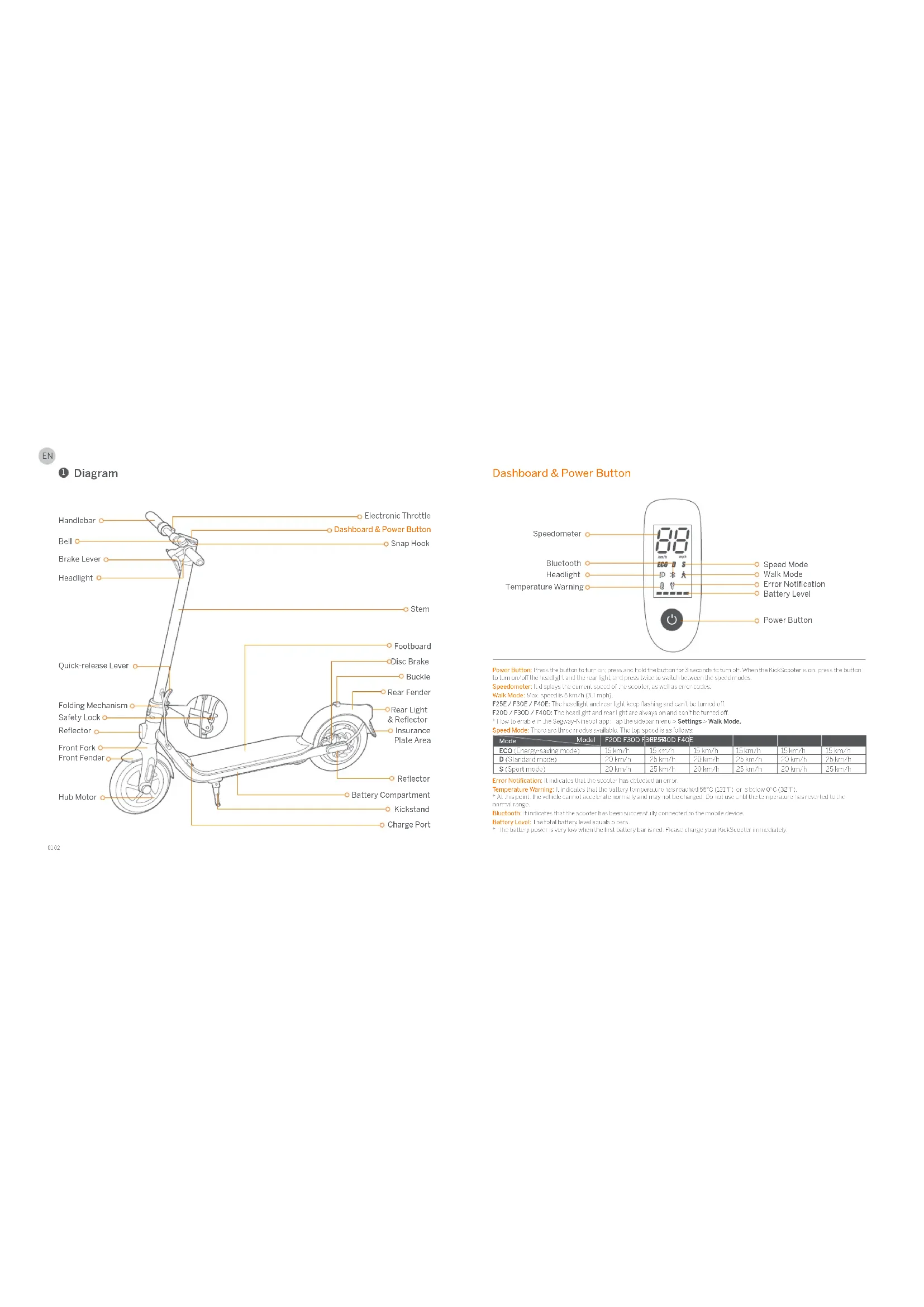 367 Wh Over-heating, short circuit, over-current, over-discharge and over-charge protection Approx. 25 km/h (15.5 mph) Approx. 40 km (24.9 miles) Approx. 20% Asphalt/flat pavement; obstacles < 0.4 in (1 cm); gaps < 1.2 in (3 cm) -10–40°C (14–104°F) -10–50°C (14–122°F) IPX5 Approx. 6.5 h 30–120 kg (66–265 lbs) 14–60 years 120–200 cm (3’11”–6’6”) N/A F40D [1] Typical Range: tested while riding under full power, 75 kg (165 lbs) load, 25°C (77°F), 60% of max. speed on average on pavement.