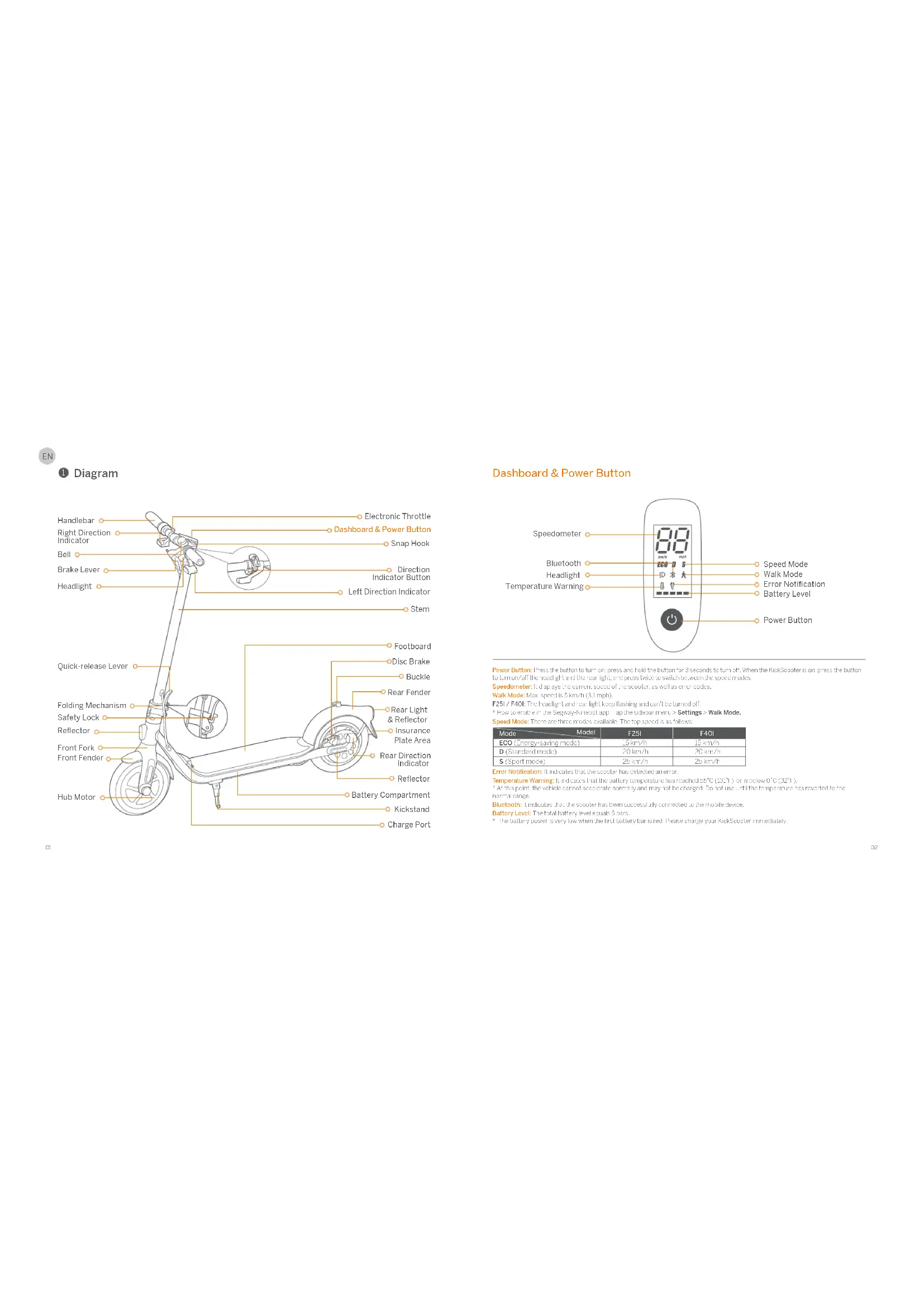 69 70 71Power Button: Press the button to turn on; press and hold the button for 3 seconds to turn off. When the KickScooter is on, press the button to turn on/off the headlight and the rear light, and press twice to switch between the speed modes. Speedometer: It displays the current speed of the scooter, as well as error codes. Walk Mode: Max. speed is 5 km/h (3.1 mph). F25I / F40I: The headlight and rear light keep flashing and can't be turned off.