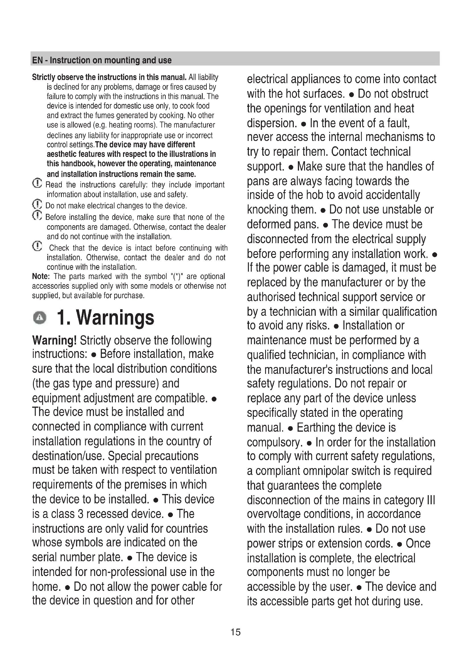 Warning! Strictly observe the following instructions: ● Before installation, make sure that the local distribution conditions (the gas type and pressure) and equipment adjustment are compatible. ● The device must be installed and connected in compliance with current installation regulations in the country of destination/use. Special precautions must be taken with respect to ventilation requirements of the premises in which the device to be installed. ● This device is a class 3 recessed device. ● The instructions are only valid for countries whose symbols are indicated on the serial number plate. ● The device is intended for non-professional use in the home. ● Do not allow the power cable for the device in question and for other electrical appliances to come into contact with the hot surfaces. ● Do not obstruct the openings for ventilation and heat dispersion. ● In the event of a fault, never access the internal mechanisms to try to repair them. Contact technical support. ● Make sure that the handles of pans are always facing towards the inside of the hob to avoid accidentally knocking them. ● Do not use unstable or deformed pans. ● The device must be disconnected from the electrical supply before performing any installation work. ● If the power cable is damaged, it must be replaced by the manufacturer or by the authorised technical support service or by a technician with a similar qualification to avoid any risks. ● Installation or maintenance must be performed by a qualified technician, in compliance with the manufacturer's instructions and local safety regulations. Do not repair or replace any part of the device unless specifically stated in the operating manual. ● Earthing the device is compulsory. ● In order for the installation to comply with current safety regulations, a compliant omnipolar switch is required that guarantees the complete disconnection of the mains in category III overvoltage conditions, in accordance with the installation rules. ● Do not use power strips or extension cords. ● Once installation is complete, the electrical components must no longer be accessible by the user. ● The device and its accessible parts get hot during use.16 Be careful not to touch the heating elements. ● Ensure that children do not play with the device; keep children away and supervise them, as the accessible parts may become very hot during use. ● During and after use, do not touch the heating elements of the device. ● Avoid contact with kitchen towels or other flammable materials until all components of the device have sufficiently cooled. ● Do not place flammable materials on or near the device. ● Overheated fats and oils easily catch fire. Take extra care when cooking food rich in fat and oil. ● If the surface is cracked, switch off the device to avoid the possibility of an electric shock. ● The device is not intended to be run with an external timer or a separate remote control system. ● The cooking process must be supervised. ● NEVER attempt to put fires out using water. Instead, turn off the device and smother the flames, for example with a lid or a fire blanket. Fire hazard: do not rest objects on the cooking surfaces. ● Do not use steam cleaners. ● Before connecting the device to the electrical network: check the data plate (on the bottom of the device) to ensure that the voltage and power correspond to the network values and that the connection socket is suitable. If in doubt, consult a qualified electrician. Important: ● After use, turn off the hob with the control device. ● To prevent liquids from boiling over, reduce the heat. ● Do not leave the heating elements on with empty pots and pans or with no pans. ● Once cooking is complete, turn off the relevant zone. ● Never leave empty pans on the hot elements when switched on. ● Do not use pans which protrude over the edges of the top.