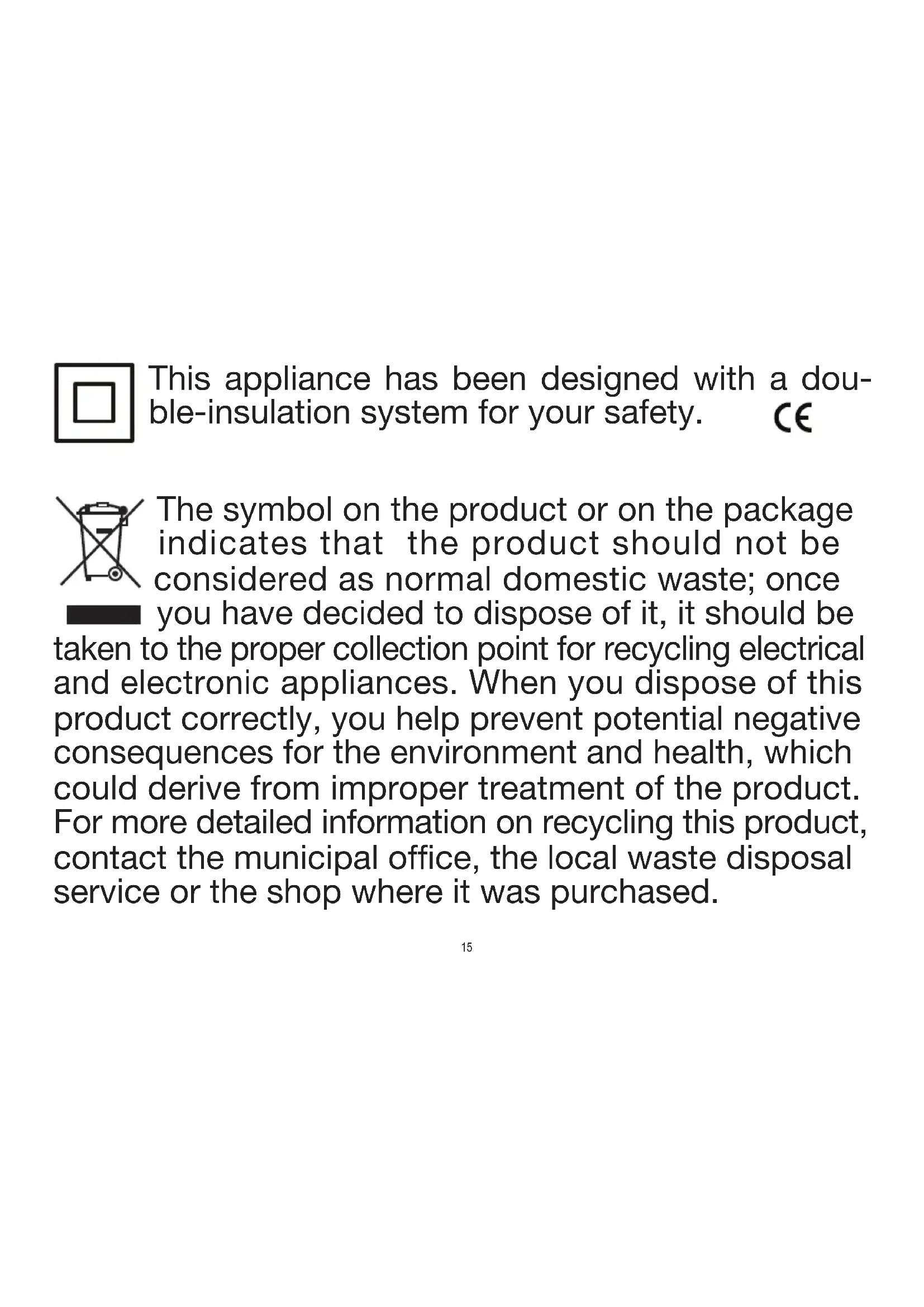 environment or on wet surfaces. Do not immerse the appliance in water or other liquids. 2 - Do not use this appliance near bathtubs or other vessels containing water. 3 - Unplug the appliance when it is off because proximity to water could pose a threat; be extra careful Dokładniejsze informacje dotyczące recyklingu przedmiotowego produktu można uzyskać w urzędzie miasta, u lokalnego dostawcy usług utylizacji odpadów lub w sklepie, w którym dokonano zakupu. OGRANICZONY OKRES GWARANCJI: Okres standardowej gwarancji na suszarki do włosów przeznaczone do sprzedaży konsumenckiej wynosi 24 miesiące, zgodnie z postanowieniami dyrektywy 1999/44/WE. Okres gwarancji dla firm na suszarki do włosów wykorzystywane w salonach piękności lub w ramach jakiejkolwiek innej działalności gospodarczej wynosi 6 miesięcy od daty zakupu. W obu przypadkach gwarancja jest udzielana na podstawie okazania oryginalnego, czytelnego i nieuszkodzonego dowodu zakupu, ponieważ liczy się widniejąca na nim data i nazwa produktu. Aby skorzystać z pomocy 11when using it in the bathroom. 4 - Do not use this electric appliance if it has been in contact with liquids, if its electric cord is damaged or if its body and/or accessories show clear signs of damage. If the appliance does not work properly, disconnect it from the power immediately and take it to an approved service centre. 5- If the electric cord is damaged, it must be replaced immediately by the manufacturer, an authorised service centre or similarly qualified persons in order to avoid a hazard.
