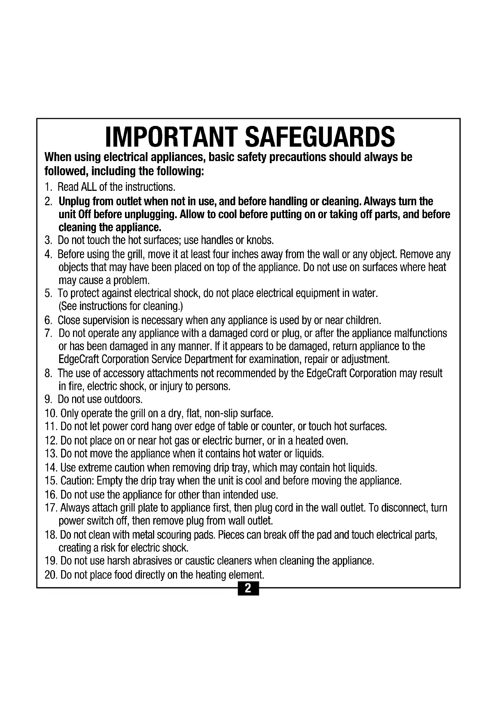 Cast Iron, Professional Indoor Electric Grill to EdgeCraft Corporation, where the cost of repair or electrical or mechanical adjustment can be estimated before the repair is undertaken. If failure occurs within the warranty period there may be no charge. Please include your return address and a brief description of the problem or damage on a separate sheet inside the box. Insure the shipment and retain a shipping receipt as evidence of shipment and for your protection against loss in shipment. Send your Indoor Grill insured and postage prepaid to: EdgeCraft Corporation 825 Southwood Road, Avondale, PA 19311 U.S.A. Telephone 800-342-3255 or 610-268-0500 www.chefschoice.com Retain evidence of shipping for your protection. Limited Warranty: Used with normal care, this EdgeCraft product is guaranteed against defective material and workmanship for a period of one (1) year from the date of original purchase (“Warranty Period”). We will repair or replace, at our option, any product or part that is defective in material or workmanship without charge if the product is returned to us postage prepaid with dated proof of purchase within the Warranty Period. This warranty does not apply to commercial use or any product abuse. ALL IMPLIED WARRANTIES, INCLUDING IMPLIED WARRANTIES OF MERCHANTABILITY AND FITNESS FOR A PARTICULAR PURPOSE, ARE LIMITED TO THE WARRANTY PERIOD. EDGECRAFT CORPORATION SHALL NOT BE LIABLE FOR ANY INCIDENTAL OR CONSEQUENTIAL DAMAGES. Some states do not allow limitations on how long an implied warranty lasts and some states do not allow exclusions or limitation of incidental or consequential damages, so the above limitations or exclusions may not apply to you. This Limited Warranty gives you specific legal rights, and you may also have other rights which vary from state to state. Conforms to: UL 1026 Certified to CAN/CSA: C22.2#64 © EdgeCraft Corporation 2014 L14 G880001Gril électrique d’intérieur professionnel Modèle 880CONSIGNES DE SECURITE IMPORTANTE Lors de l’utilisation d’appareils électriques, des précautions élémentaires de sécurité doivent toujours être respectées, notamment :