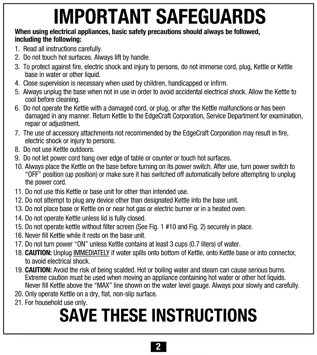 15. Do not operate kettle without filter screen (See Fig. 1 #10 and Fig. 2) securely in place.