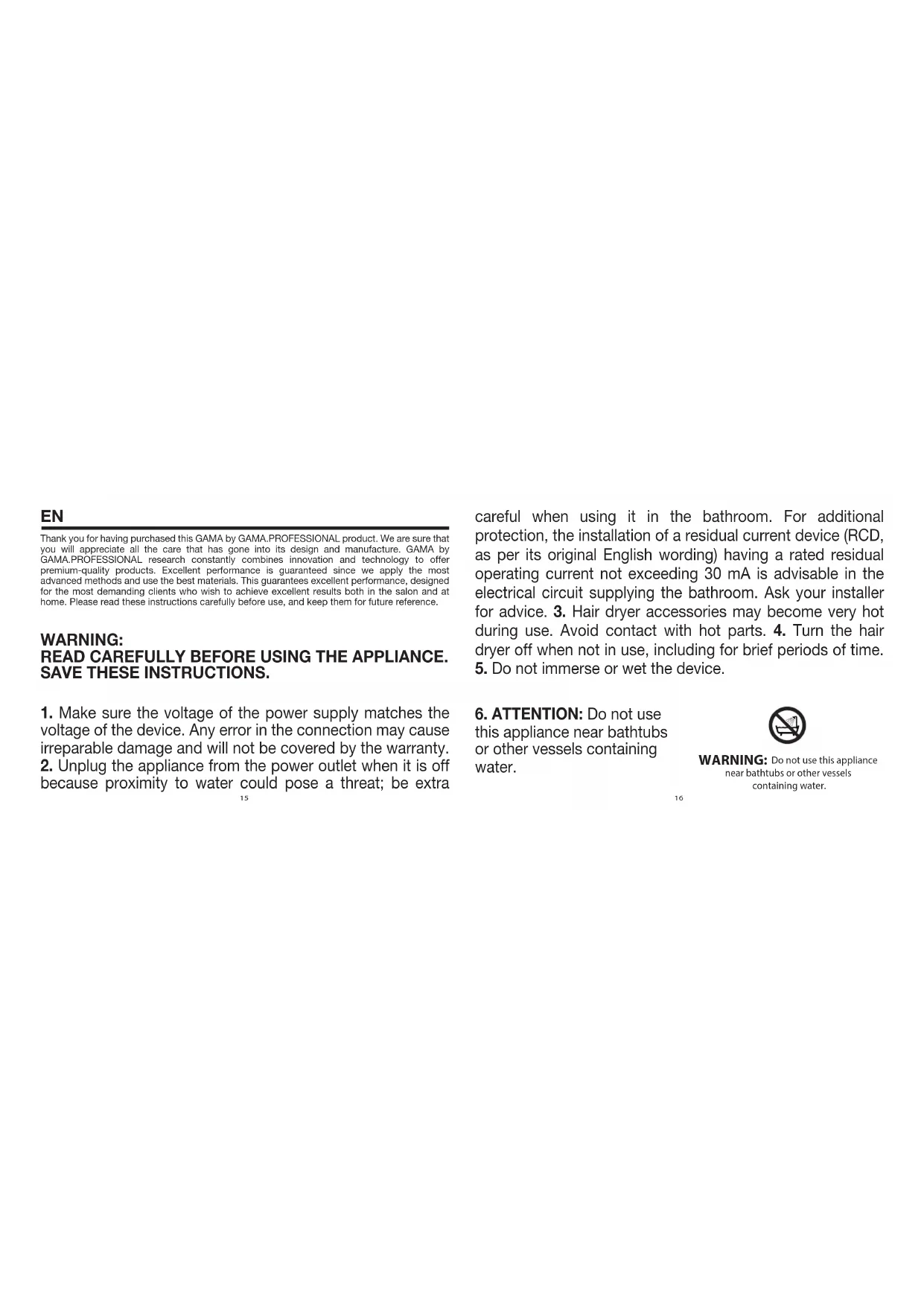 Thank you for having purchased this GAMA by GAMA.PROFESSIONAL product. We are sure that you will appreciate all the care that has gone into its design and manufacture. GAMA by GAMA.PROFESSIONAL research constantly combines innovation and technology to offer premium-quality products. Excellent performance is guaranteed since we apply the most advanced methods and use the best materials. This guarantees excellent performance, designed for the most demanding clients who wish to achieve excellent results both in the salon and at home. Please read these instructions carefully before use, and keep them for future reference.