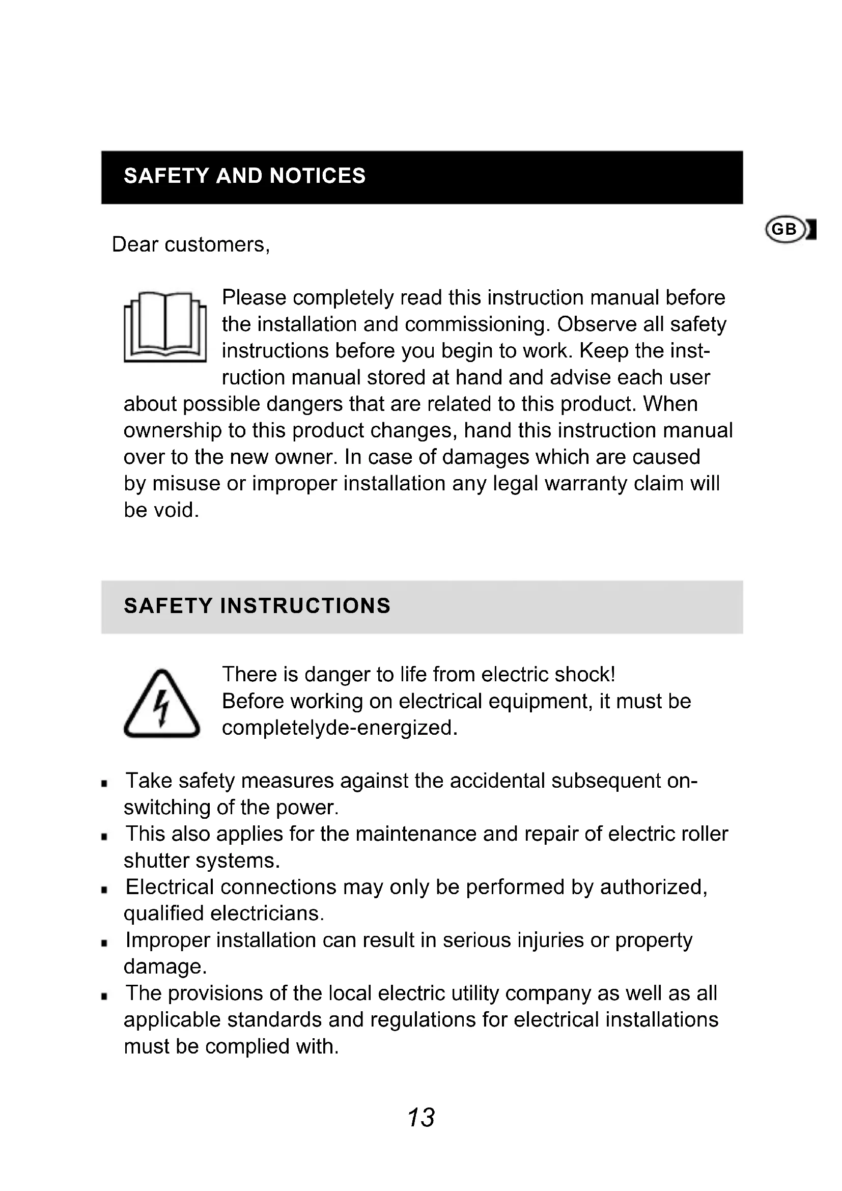 Dear customers, Please completely read this instruction manual before the installation and commissioning. Observe all safety instructions before you begin to work. Keep the inst- ruction manual stored at hand and advise each user about possible dangers that are related to this product. When ownership to this product changes, hand this instruction manual over to the new owner. In case of damages which are caused by misuse or improper installation any legal warranty claim will be void. SAFETY INSTRUCTIONS There is danger to life from electric shock! Before working on electrical equipment, it must be com pletely de-energized. Take safety measures against the accidental subsequent on- switching of the power. This also applies for the maintenance and repair of electric roller shutter systems. Electrical connections may only be performed by authorized, qualied electricians. Improper installation can result in serious injuries or property damage. The provisions of the local electric utility company as well as all applicable standards and regulations for electrical installations must be complied with.14 The product may only be used in dry rooms (IP20). The product and the packaging are not toys. Keep children away from it, since there is a risk of injury or suocation. Do not open the product, risk of injury. Keep people away from the movement range of the roller shutter system. The movement range of the roller shutter system must be completely visually accessible during the operation. Risk of injury. INTENDED USE The product (Item No. 20032/20037) is exclusively designed for the respectively approved wireless products of the Alfred Schel- lenberg GmbH. The roller shutter or awning system and its components must be in a perfect condition. Defects in the system or its parts must be repaired before installing the radio reception module. Any other or further utilization beyond the explicitly specied shall be regarded as not intended use. Alfred Schellenberg GmbH shall not be liable for any conse- quential damage, property damage and personal injury due to improper use. The operation of the hand-held wireless remote control in the vicinity of equipment that emits electromagnetic radiation or has metal surfaces can aect the correct operation. The structural conditions aect the range and function of the radio equipment. The radio equipment may not be operated in areas with high risk or if third parties are disturbed (for example, hospitals, airports and similar facilities). There is no protection from interference from other properly constructed or operatedradio equipment. Particularly from pro- perly operating systems that utilize the same frequency range.1514