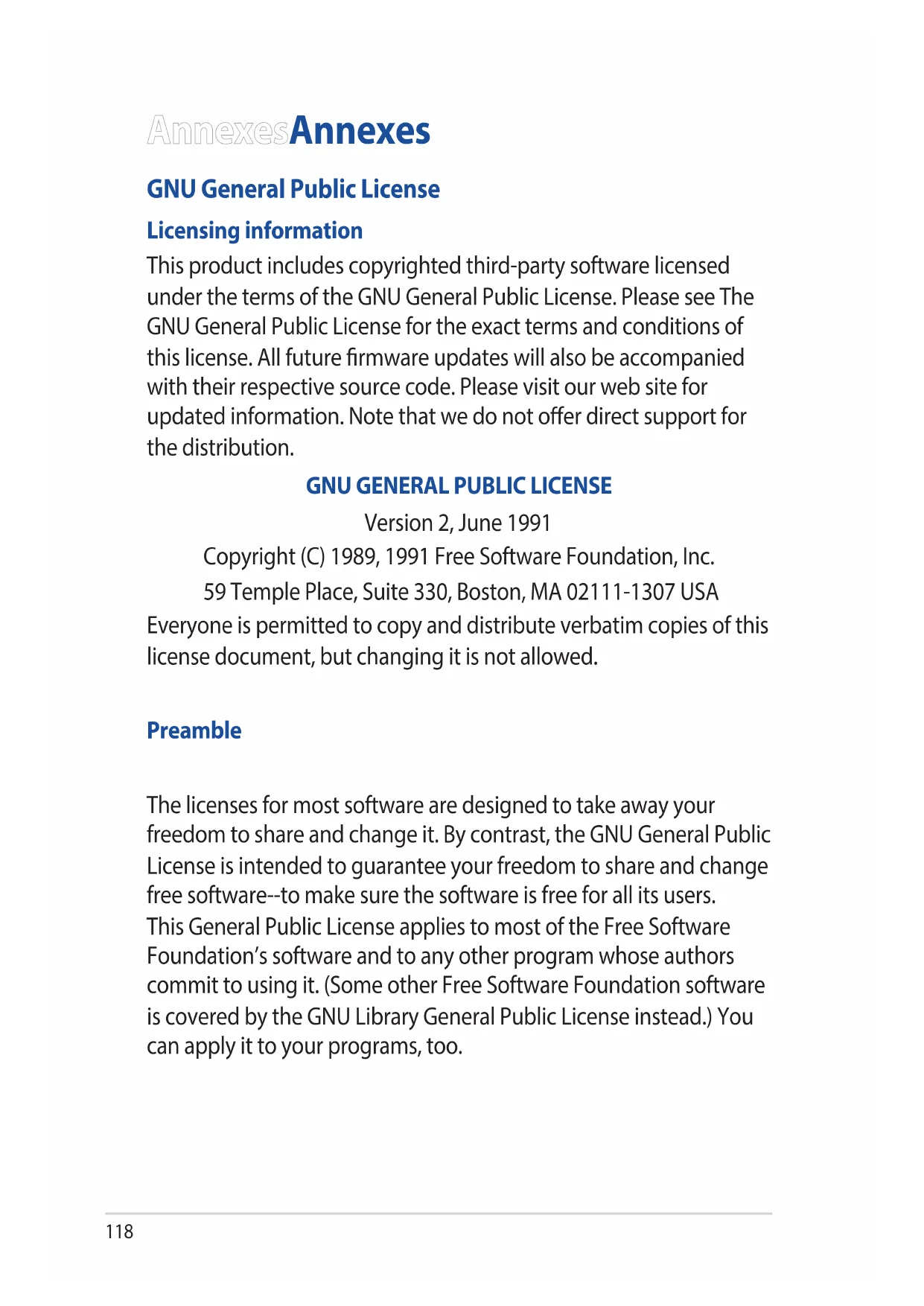 Version 2, June 1991 Copyright (C) 1989, 1991 Free Software Foundation, Inc. 59 Temple Place, Suite 330, Boston, MA 02111-1307 USA Everyone is permitted to copy and distribute verbatim copies of this license document, but changing it is not allowed. Preamble The licenses for most software are designed to take away your freedom to share and change it. By contrast, the GNU General Public License is intended to guarantee your freedom to share and change free software--to make sure the software is free for all its users. This General Public License applies to most of the Free Software Foundation’s software and to any other program whose authors commit to using it. (Some other Free Software Foundation software is covered by the GNU Library General Public License instead.) You can apply it to your programs, too. AnnexesAnnexes119 When we speak of free software, we are referring to freedom, not price. Our General Public Licenses are designed to make sure that you have the freedom to distribute copies of free software (and charge for this service if you wish), that you receive source code or can get it if you want it, that you can change the software or use pieces of it in new free programs; and that you know you can do these things. To protect your rights, we need to make restrictions that forbid anyone to deny you these rights or to ask you to surrender the rights. These restrictions translate to certain responsibilities for you if you distribute copies of the software, or if you modify it. For example, if you distribute copies of such a program, whether gratis or for a fee, you must give the recipients all the rights that you have. You must make sure that they, too, receive or can get the source code. And you must show them these terms so they know their rights. We protect your rights with two steps: (1) copyright the software, and (2) oer you this license which gives you legal permission to copy, distribute and/or modify the software. Also, for each author’s protection and ours, we want to make certain that everyone understands that there is no warranty for this free software. If the software is modied by someone else and passed on, we want its recipients to know that what they have is not the original, so that any problems introduced by others will not reect on the original authors’ reputations.120 Finally, any free program is threatened constantly by software patents. We wish to avoid the danger that redistributors of a free program will individually obtain patent licenses, in eect making the program proprietary. To prevent this, we have made it clear that any patent must be licensed for everyone’s free use or not licensed at all. The precise terms and conditions for copying, distribution and modication follow. Terms & conditions for copying, distribution, & modication