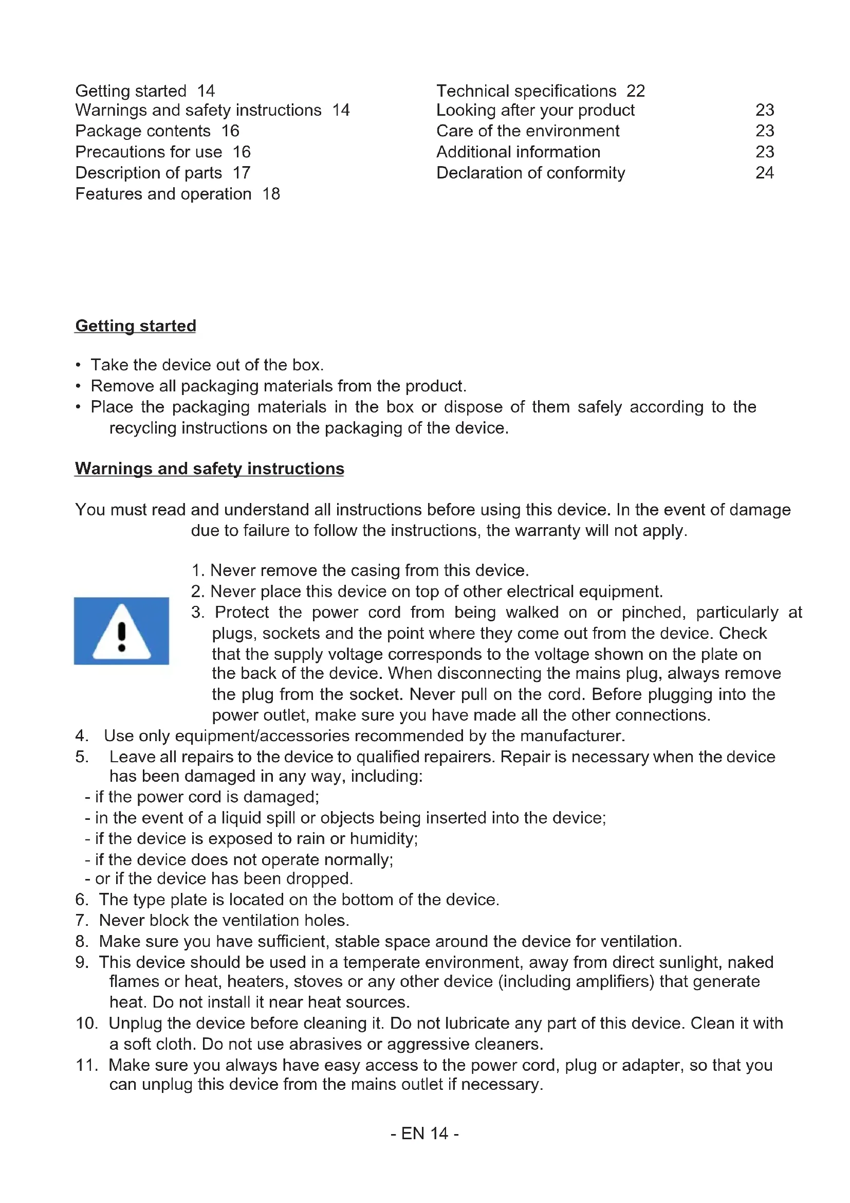 can unplug this device from the mains outlet if necessary. Getting arted 14 Warnings and safety inructions 14 Package contents 16 Precautions for use 16 Description of parts 17 Features and operation 18 Technical specications 22 Looking after your product 23 Care of the environment 23 Additional information 23 Declaration of conformity 24- EN 15 -