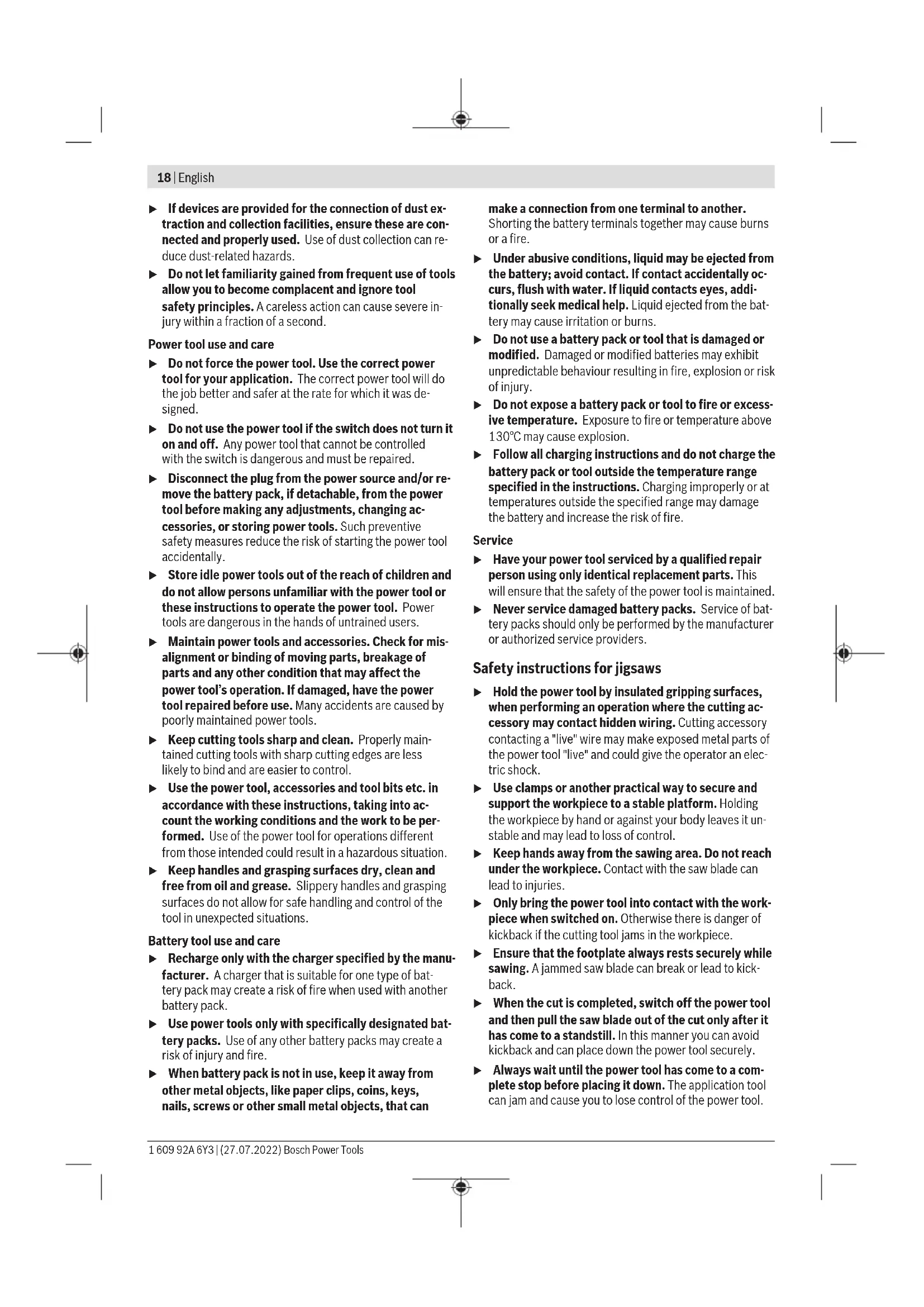 The vibration level and noise emission value given in these instructions have been measured in accordance with a standardised measuring procedure and may be used to com- pare power tools. They may also be used for a preliminary estimation of vibration and noise emissions. The stated vibration level and noise emission value repres- ent the main applications of the power tool. However, if the power tool is used for other applications, with different ap- plication tools or is poorly maintained, the vibration level and noise emission value may differ. This may significantly increase the vibration and noise emissions over the total working period. To estimate vibration and noise emissions accurately, the times when the tool is switched off or when it is running but not actually being used should also be taken into account. This may significantly reduce vibration and noise emissions over the total working period. Implement additional safety measures to protect the oper- ator from the effects of vibration, such as servicing the power tool and application tools, keeping their hands warm, and organising workflows correctly. Rechargeable battery Bosch sells some cordless power tools without a re- chargeable battery. You can tell whether a rechargeable bat- tery is included with the power tool by looking at the pack- aging. Charging the battery u Use only the chargers listed in the technical data. Only these chargers are matched to the lithium-ion battery of your power tool. Note: Lithium-ion rechargeable batteries are supplied par- tially charged according to international transport regula- tions. To ensure full rechargeable battery capacity, fully charge the rechargeable battery before using your tool for the first time. Inserting the Battery Push the charged battery into the battery holder until it clicks into place. Removing the Battery To remove the rechargeable battery, press the battery re- lease button and pull the battery out. Do not use force to do this. The rechargeablebattery has two locking levels to prevent the battery from falling out if the battery releasebutton is pressed unintentionally. The rechargeable battery is held in place by a spring when fitted in the power tool. Battery charge indicator The green LEDs on the battery charge indicator indicate the state of charge of the battery. For safety reasons, it is only possible to check the state of charge when the power tool is not in operation. Press the button for the battery charge indicator or to show the state of charge. This is also possible when the bat- tery is removed. If no LED lights up after pressing the button for the battery charge indicator, then the battery is defective and must be replaced. The state of charge of the battery is also displayed on the user interface (see "Status indicators", page23). Battery model GBA 18V... LED Capacity 3× continuous green light 60–100% 2× continuous green light 30–60% 1× continuous green light 5–30% 1× flashing green light 0–5% Battery model ProCORE18V... LED Capacity 5 × continuous green light 80–100% 4 × continuous green light 60–80% 3 × continuous green light 40–60% 2 × continuous green light 20–40% 1 × continuous green light 5–20% 1 × flashing green light 0–5% Recommendations for Optimal Handling of the Battery Protect the battery against moisture and water. Only store the battery within a temperature range of −20 to 50°C. Do not leave the battery in your car in the summer, for example. Occasionally clean the ventilation slots on the battery using a soft brush that is clean and dry. A significantly reduced operating time after charging indic- ates that the battery has deteriorated and must be replaced. Follow the instructions on correct disposal. Bosch Power Tools 1 609 92A 6Y3 | (27.07.2022)22 | English Assembly u Remove the battery from the power tool before carry- ing out work on the power tool (e.g. maintenance, changing tool, etc.). The battery should also be re- moved for transport and storage. There is risk of injury from unintentionally pressing the on/off switch. Inserting/changing the saw blade u When fitting or changing the saw blade, wear protect- ive gloves. Blades are sharp and can become hot when used for prolonged periods of time. Selecting the saw blade You will find an overview of recommended saw blades at the end of these operating instructions. Only use saw blades with single lug shank (T shank). The saw blade should not be longer than required for the intended cut. Use a narrow saw blade when sawing tight curves. Inserting the saw blade and adjusting the saw blade guide (seefiguresA–B) u Clean the shaft on the saw blade before inserting it. Adirty shaft cannot be securely fixed in place. If necessary, remove the hood(28). Pull the SDS lever(19) forward as far as it will go and hold it there. Push the saw blade(16), with the teeth in the cutting direction, into the saw blade receptacle (18) until it clicks into place. Make sure when inserting the saw blade that the saw blade is in between the jaws of the saw blade guide(15). u Check that the saw blade is seated securely. A loose saw blade can fall out and lead to injuries. For a good cutting result, the jaws of the saw blade guide(15) should be as close as possible to the saw blade(16) without clamping the saw blade. To adjust the distance to the thickness of the saw blade, you can adjust a jaw on the saw blade guide. Insert the hex key(26) into the adjustment opening(24) in the base plate. Turn the hex keyas indicated by the marking next to the adjustment opening (clockwise to shorten the distance, anticlockwise to increase the distance). Make sure that the saw blade can still turn freely. Removing the saw blade (seefigureC) Pull the SDS lever(19) all the way forwards and remove the saw blade(16). Anti-splinter guard (seefigureD) The anti-splinter guard (27) (accessory) can prevent splin- tering of the surface while sawing wood. The anti-splinter guard can only be used with