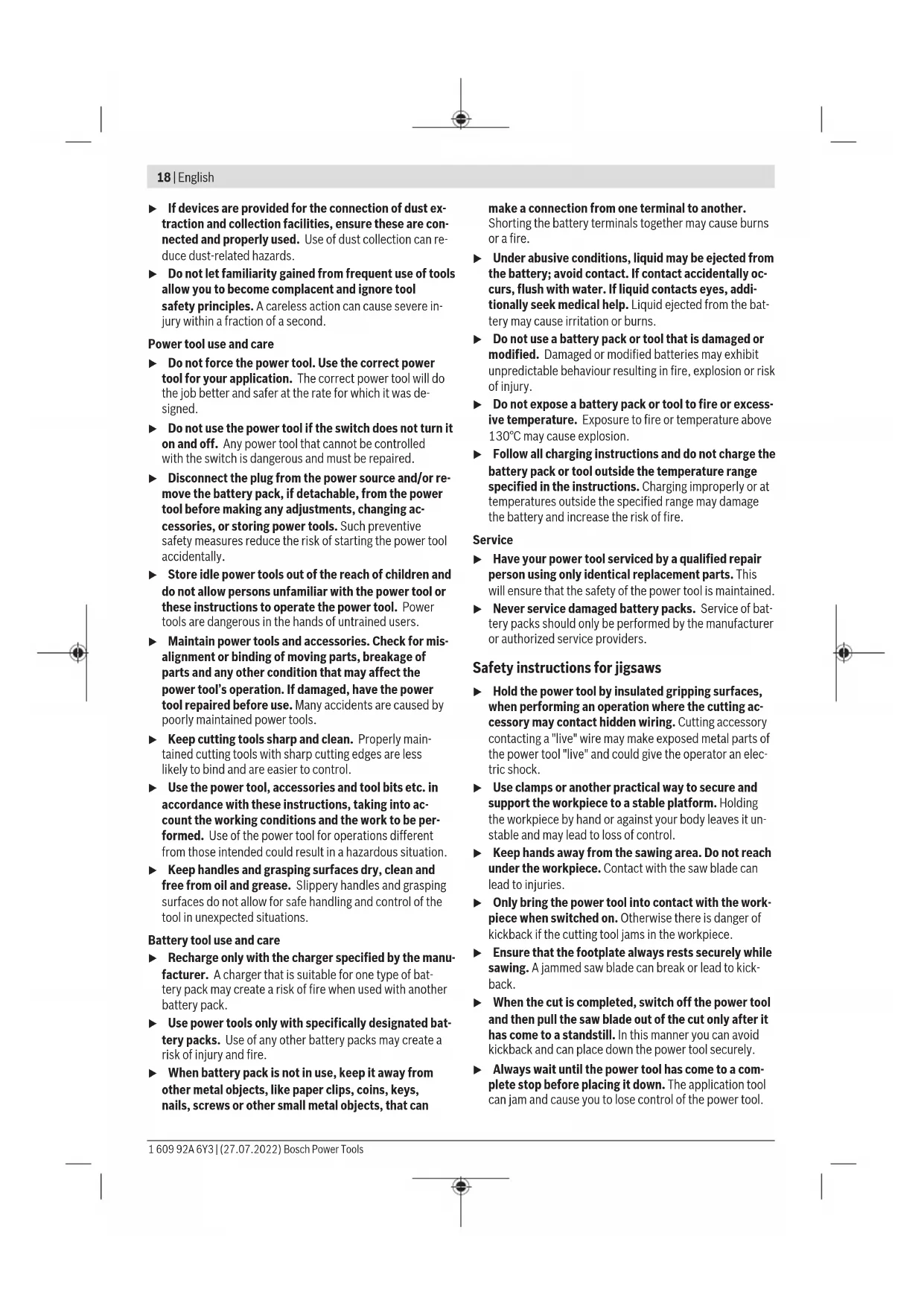 The vibration level and noise emission value given in these instructions have been measured in accordance with a standardised measuring procedure and may be used to com- pare power tools. They may also be used for a preliminary estimation of vibration and noise emissions. The stated vibration level and noise emission value repres- ent the main applications of the power tool. However, if the power tool is used for other applications, with different ap- plication tools or is poorly maintained, the vibration level and noise emission value may differ. This may significantly increase the vibration and noise emissions over the total working period. To estimate vibration and noise emissions accurately, the times when the tool is switched off or when it is running but not actually being used should also be taken into account. This may significantly reduce vibration and noise emissions over the total working period. Implement additional safety measures to protect the oper- ator from the effects of vibration, such as servicing the power tool and application tools, keeping their hands warm, and organising workflows correctly. Rechargeable battery Bosch sells some cordless power tools without a re- chargeable battery. You can tell whether a rechargeable bat- tery is included with the power tool by looking at the pack- aging. Charging the battery u Use only the chargers listed in the technical data. Only these chargers are matched to the lithium-ion battery of your power tool. Note: Lithium-ion rechargeable batteries are supplied par- tially charged according to international transport regula- tions. To ensure full rechargeable battery capacity, fully charge the rechargeable battery before using your tool for the first time. Inserting the Battery Push the charged battery into the battery holder until it clicks into place. Removing the Battery To remove the rechargeable battery, press the battery re- lease button and pull the battery out. Do not use force to do this. The rechargeablebattery has two locking levels to prevent the battery from falling out if the battery releasebutton is pressed unintentionally. The rechargeable battery is held in place by a spring when fitted in the power tool. Battery charge indicator The green LEDs on the battery charge indicator indicate the state of charge of the battery. For safety reasons, it is only possible to check the state of charge when the power tool is not in operation. Press the button for the battery charge indicator or to show the state of charge. This is also possible when the bat- tery is removed. If no LED lights up after pressing the button for the battery charge indicator, then the battery is defective and must be replaced. The state of charge of the battery is also displayed on the user interface (see "Status indicators", page23). Battery model GBA 18V... LED Capacity 3× continuous green light 60–100% 2× continuous green light 30–60% 1× continuous green light 5–30% 1× flashing green light 0–5% Battery model ProCORE18V... LED Capacity 5 × continuous green light 80–100% 4 × continuous green light 60–80% 3 × continuous green light 40–60% 2 × continuous green light 20–40% 1 × continuous green light 5–20% 1 × flashing green light 0–5% Recommendations for Optimal Handling of the Battery Protect the battery against moisture and water. Only store the battery within a temperature range of −20 to 50°C. Do not leave the battery in your car in the summer, for example. Occasionally clean the ventilation slots on the battery using a soft brush that is clean and dry. A significantly reduced operating time after charging indic- ates that the battery has deteriorated and must be replaced. Follow the instructions on correct disposal. Bosch Power Tools 1 609 92A 6Y3 | (27.07.2022)22 | English Assembly u Remove the battery from the power tool before carry- ing out work on the power tool (e.g. maintenance, changing tool, etc.). The battery should also be re- moved for transport and storage. There is risk of injury from unintentionally pressing the on/off switch. Inserting/changing the saw blade u When fitting or changing the saw blade, wear protect- ive gloves. Blades are sharp and can become hot when used for prolonged periods of time. Selecting the saw blade You will find an overview of recommended saw blades at the end of these operating instructions. Only use saw blades with single lug shank (T shank). The saw blade should not be longer than required for the intended cut. Use a narrow saw blade when sawing tight curves. Inserting the saw blade and adjusting the saw blade guide (seefiguresA–B) u Clean the shaft on the saw blade before inserting it. Adirty shaft cannot be securely fixed in place. If necessary, remove the hood(28). Pull the SDS lever(19) forward as far as it will go and hold it there. Push the saw blade(16), with the teeth in the cutting direction, into the saw blade receptacle (18) until it clicks into place. Make sure when inserting the saw blade that the saw blade is in between the jaws of the saw blade guide(15). u Check that the saw blade is seated securely. A loose saw blade can fall out and lead to injuries. For a good cutting result, the jaws of the saw blade guide(15) should be as close as possible to the saw blade(16) without clamping the saw blade. To adjust the distance to the thickness of the saw blade, you can adjust a jaw on the saw blade guide. Insert the hex key(26) into the adjustment opening(24) in the base plate. Turn the hex keyas indicated by the marking next to the adjustment opening (clockwise to shorten the distance, anticlockwise to increase the distance). Make sure that the saw blade can still turn freely. Removing the saw blade (seefigureC) Pull the SDS lever(19) all the way forwards and remove the saw blade(16). Anti-splinter guard (seefigureD) The anti-splinter guard (27) (accessory) can prevent splin- tering of the surface while sawing wood. The anti-splinter guard can only be used with