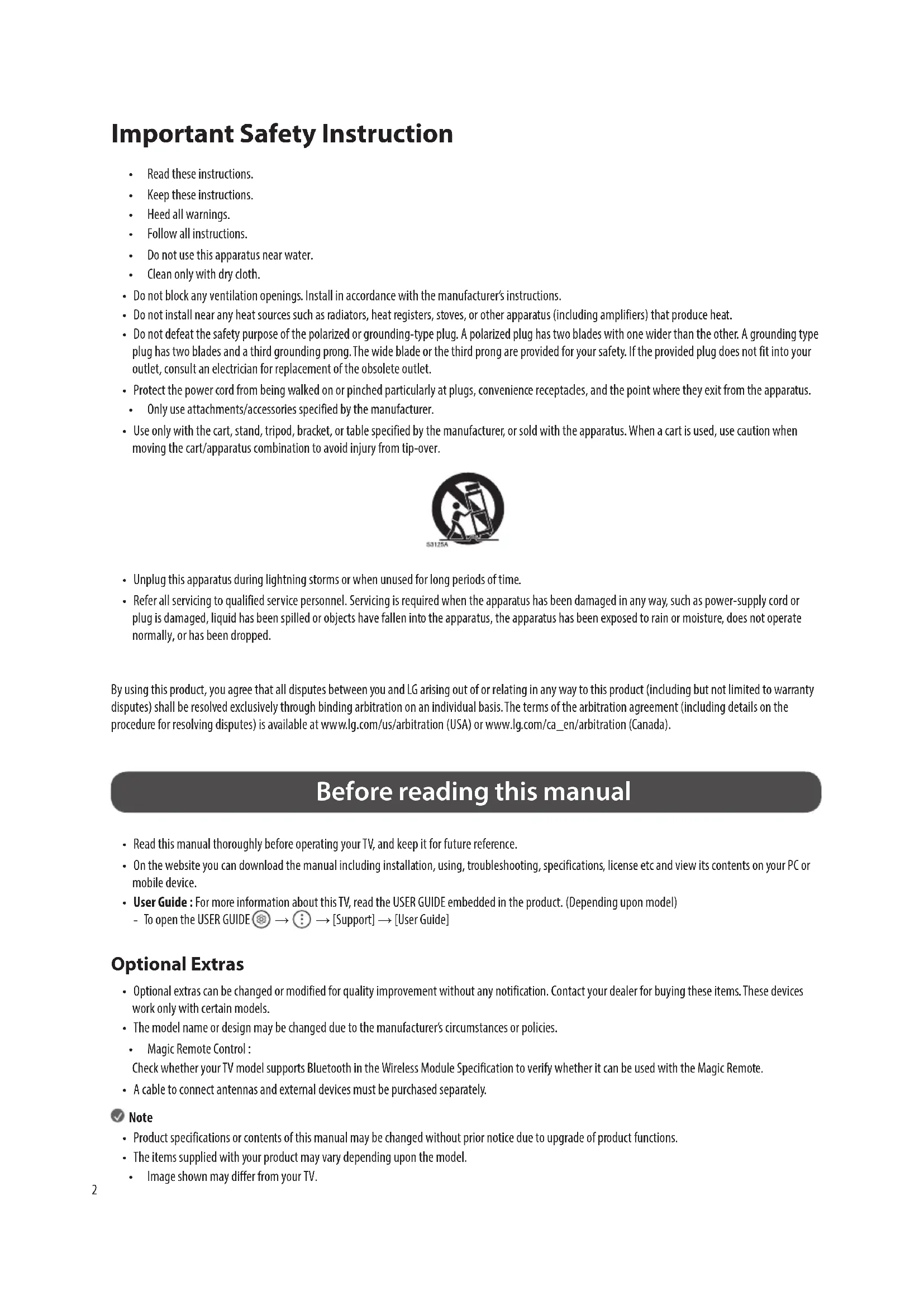 - Image shown may differ from your TV. By using this product, you agree that all disputes between you and LG arising out of or relating in any way to this product (including but not limited to warranty disputes) shall be resolved exclusively through binding arbitration on an individual basis. The terms of the arbitration agreement (including details on the procedure for resolving disputes) is available at www.lg.com/us/arbitration (USA) or www.lg.com/ca_en/arbitration (Canada).3 Warning! Safety instructions CAUTION