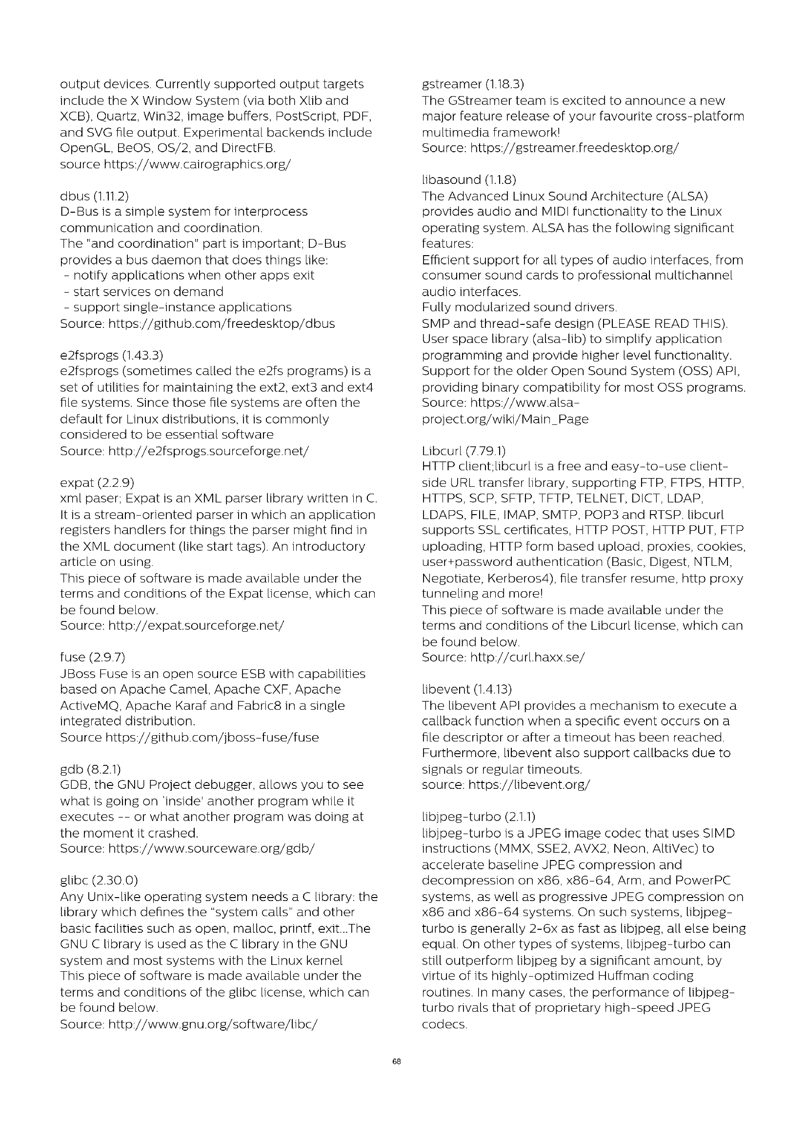 QUE SOIT LEUR NATURE. TP Vision Netherlands B.V. ne fournit aucun support pour ces logiciels. Les dispositions ci-dessus n'affectent pas les dispositions légales concernant vos droits de garantie et statutaires relatifs aux produits TP Vision Netherlands B.V. achetés par vos soins. Elles ne s'appliquent qu'au code source mis à votre disposition. Open Source apr (1.7.0) The Apache Portable Runtime Library provides a predictable and consistent interface to underlying platform-specific implementations, with an API to which software developers may code and be assured of predictable if not identical behavior regardless of the platform on which their software is built, relieving them of the need to code special-case conditions to work around or take advantage of platform-specific deficiencies or features. Source: https://github.com/apache/apr bind ( 9.11.36) BIND (Berkeley Internet Name Domain) is a complete, highly portable implementation of the Domain Name System (DNS) protocol. Source: https://github.com/isc-projects/bind9 busybox (1.31.1) BusyBox combines tiny versions of many common UNIX utilities into a single small executable. It provides replacements for most of the utilities you usually find in GNU fileutils, shellutils, etc. The utilities in BusyBox generally have fewer options than their full-featured GNU cousins; however, the options that are included provide the expected functionality and behave very much like their GNU counterparts. BusyBox provides a fairly complete environment for any small or embedded system. Source: https://www.busybox.net/downloads/ binutils (2.31.510 The GNU Binutils are a collection of binary tools. The main ones are: ld - the GNU linker. as - the GNU assembler. Source: https://www.gnu.org/software/binutils/ bzip2 (1.0.6) bzip2 is a free and open-source file compression program that uses the Burrows–Wheeler algorithm. It only compresses single files and is not a file archiver. It was developed by Julian Seward, and maintained by Mark Wielaard and Micah Snyder. Source: https://sourceware.org/bzip2/ c-ares (1.10.1) c-ares is a C library for asynchronous DNS requests (including name resolves) Source: https://c-ares.org/ cario (1.16.0) Cairo is a 2D graphics library with support for multiple 67output devices. Currently supported output targets include the X Window System (via both Xlib and XCB), Quartz, Win32, image buffers, PostScript, PDF, and SVG file output. Experimental backends include OpenGL, BeOS, OS/2, and DirectFB. source https://www.cairographics.org/ dbus (1.11.2) D-Bus is a simple system for interprocess communication and coordination. The "and coordination" part is important; D-Bus provides a bus daemon that does things like: - notify applications when other apps exit - start services on demand - support single-instance applications Source: https://github.com/freedesktop/dbus e2fsprogs (1.43.3) e2fsprogs (sometimes called the e2fs programs) is a set of utilities for maintaining the ext2, ext3 and ext4 file systems. Since those file systems are often the default for Linux distributions, it is commonly considered to be essential software Source: http://e2fsprogs.sourceforge.net/ expat (2.2.9) xml paser; Expat is an XML parser library written in C. It is a stream-oriented parser in which an application registers handlers for things the parser might find in the XML document (like start tags). An introductory article on using. This piece of software is made available under the terms and conditions of the Expat license, which can be found below. Source: http://expat.sourceforge.net/ fuse (2.9.7) JBoss Fuse is an open source ESB with capabilities based on Apache Camel, Apache CXF, Apache ActiveMQ, Apache Karaf and Fabric8 in a single integrated distribution. Source https://github.com/jboss-fuse/fuse gdb (8.2.1) GDB, the GNU Project debugger, allows you to see what is going on `inside' another program while it executes -- or what another program was doing at the moment it crashed. Source: https://www.sourceware.org/gdb/ glibc (2.30.0) Any Unix-like operating system needs a C library: the library which defines the “system calls” and other basic facilities such as open, malloc, printf, exit...The GNU C library is used as the C library in the GNU system and most systems with the Linux kernel This piece of software is made available under the terms and conditions of the glibc license, which can be found below. Source: http://www.gnu.org/software/libc/ gstreamer (1.18.3) The GStreamer team is excited to announce a new major feature release of your favourite cross-platform multimedia framework! Source: https://gstreamer.freedesktop.org/ libasound (1.1.8) The Advanced Linux Sound Architecture (ALSA) provides audio and MIDI functionality to the Linux operating system. ALSA has the following significant features: Efficient support for all types of audio interfaces, from consumer sound cards to professional multichannel audio interfaces. Fully modularized sound drivers. SMP and thread-safe design (PLEASE READ THIS). User space library (alsa-lib) to simplify application programming and provide higher level functionality. Support for the older Open Sound System (OSS) API, providing binary compatibility for most OSS programs. Source: https://www.alsa- project.org/wiki/Main_Page Libcurl (7.79.1) HTTP client;libcurl is a free and easy-to-use client- side URL transfer library, supporting FTP, FTPS, HTTP, HTTPS, SCP, SFTP, TFTP, TELNET, DICT, LDAP, LDAPS, FILE, IMAP, SMTP, POP3 and RTSP. libcurl supports SSL certificates, HTTP POST, HTTP PUT, FTP uploading, HTTP form based upload, proxies, cookies, user+password authentication (Basic, Digest, NTLM, Negotiate, Kerberos4), file transfer resume, http proxy tunneling and more! This piece of software is made available under the terms and conditions of the Libcurl license, which can be found below. Source: http://curl.haxx.se/ libevent (1.4.13) The libevent API provides a mechanism to execute a callback function when 