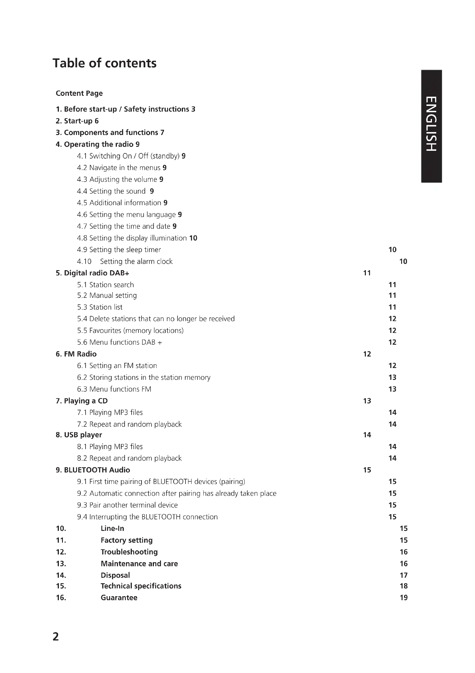 - when leaving a battery in an environment with extremely high temperatures or with extremely low air pressure, which may cause an explosion or escaping of flammable liquids or gases. Automatic energy saving function The model is equipped with an automatic energy saving function. This switches the device to standby mode within 15 minutes if it is played at a very low volume or if the radio is muted. This setting cannot be changed.