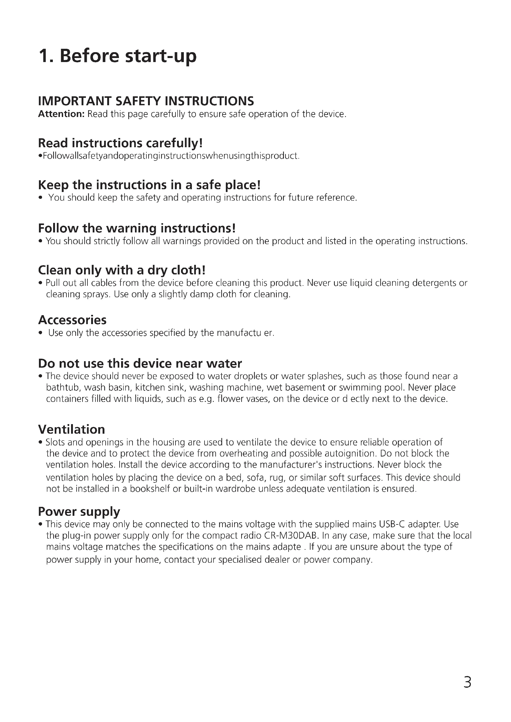 - This device may only be connected to the mains voltage with the supplied mains USB-C adapter. Use the plug-in power supply only for the compact radio CR-M30DAB. In any case, make sure that the local mains voltage matches the specifications on the mains adapte . If you are unsure about the type of power supply in your home, contact your specialised dealer or power company.4 Mains adapter