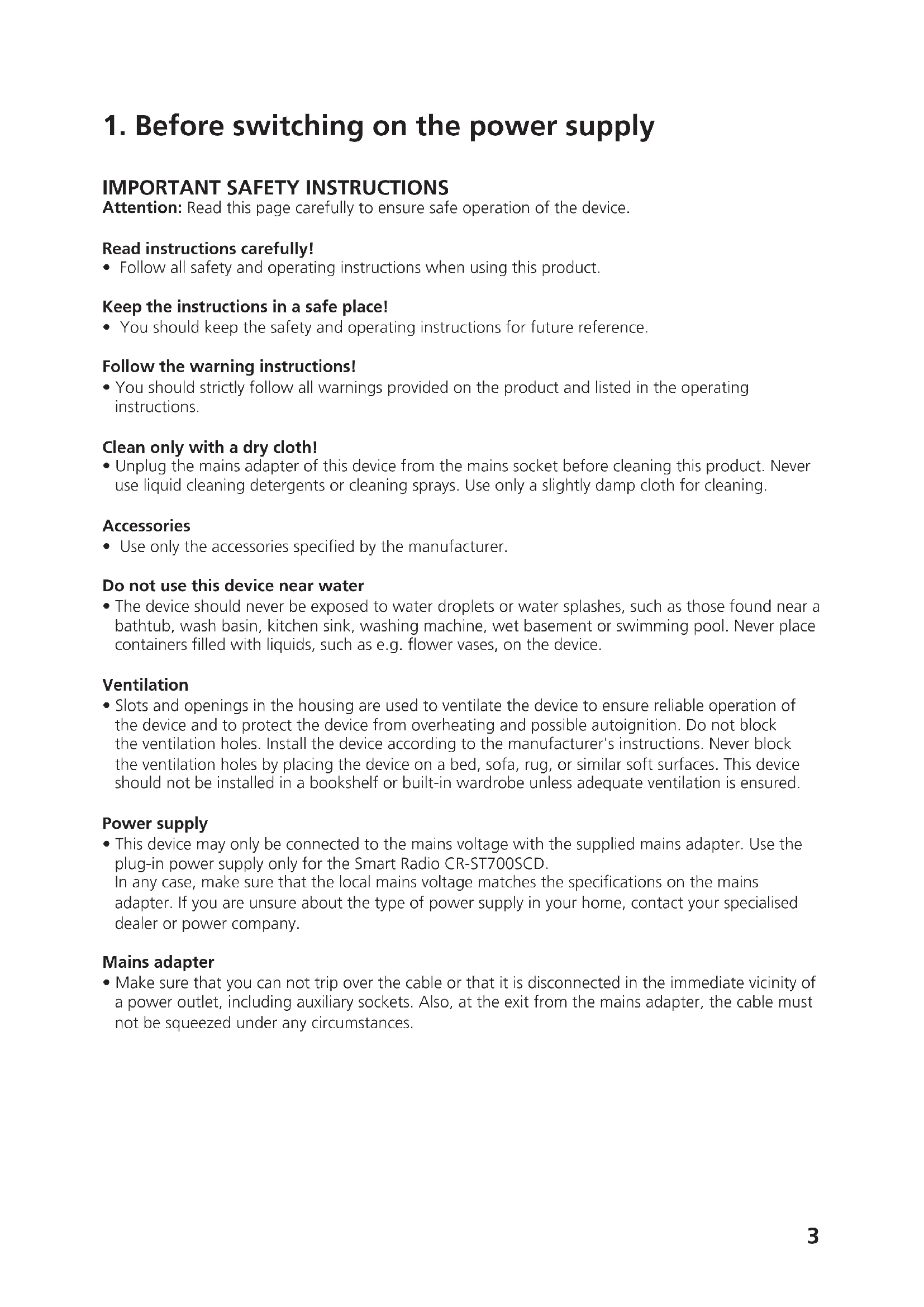 - This device may only be connected to the mains voltage with the supplied mains adapter. Use the plug-in power supply only for the Smart Radio CR-ST700SCD. In any case, make sure that the local mains voltage matches the specifications on the mains adapter. If you are unsure about the type of power supply in your home, contact your specialised dealer or power company. Mains adapter