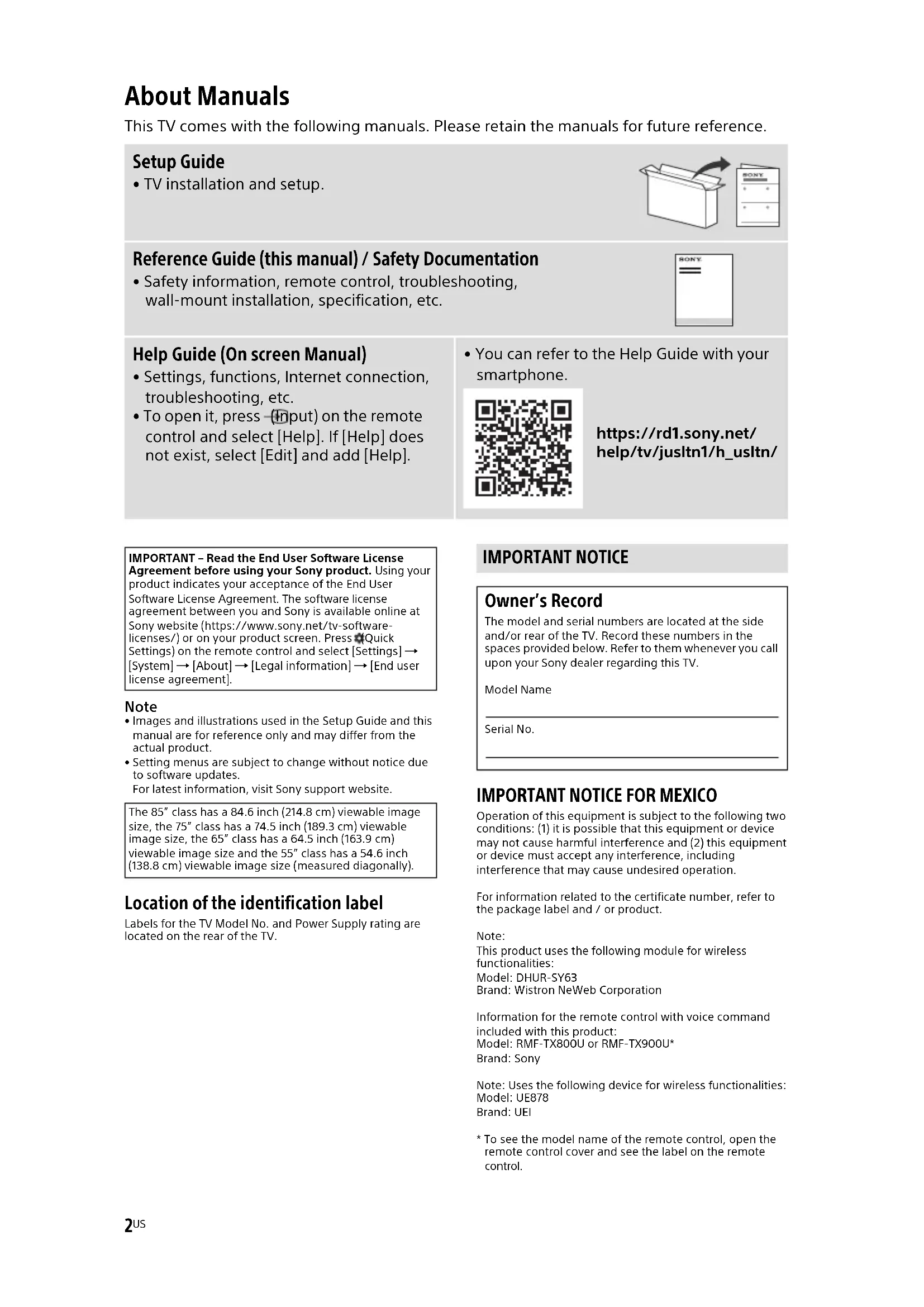 - You can refer to the Help Guide with your smartphone. https://rd1.sony.net/ help/tv/jusltn1/h_usltn/ IMPORTANT – Read the End User Software License Agreement before using your Sony product. Using your product indicates your acceptance of the End User Software License Agreement. The software license agreement between you and Sony is available online at Sony website (https://www.sony.net/tv-software- licenses/) or on your product screen. Press (Quick Settings) on the remote control and select [Settings] [System] [About] [Legal information] [End user license agreement]. The 85” class has a 84.6 inch (214.8 cm) viewable image size, the 75” class has a 74.5 inch (189.3 cm) viewable image size, the 65” class has a 64.5 inch (163.9 cm) viewable image size and the 55” class has a 54.6 inch (138.8 cm) viewable image size (measured diagonally). IMPORTANT NOTICE Owner’s Record The model and serial numbers are located at the side and/or rear of the TV. Record these numbers in the spaces provided below. Refer to them whenever you call upon your Sony dealer regarding this TV. Model Name Serial No.3