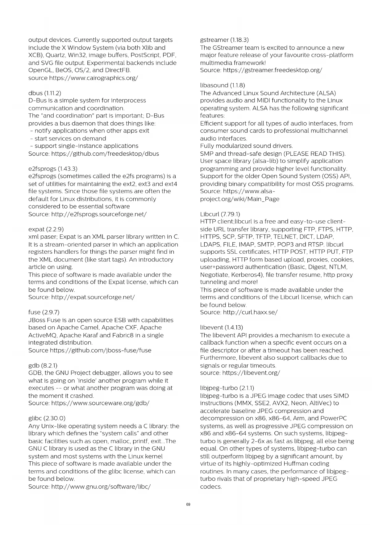 QUE SOIT LEUR NATURE. TP Vision Netherlands B.V. ne fournit aucun support pour ces logiciels. Les dispositions ci-dessus n'affectent pas les dispositions légales concernant vos droits de garantie et statutaires relatifs aux produits TP Vision Netherlands B.V. achetés par vos soins. Elles ne s'appliquent qu'au code source mis à votre disposition. Open Source apr (1.7.0) The Apache Portable Runtime Library provides a predictable and consistent interface to underlying platform-specific implementations, with an API to which software developers may code and be assured of predictable if not identical behavior regardless of the platform on which their software is built, relieving them of the need to code special-case conditions to work around or take advantage of platform-specific deficiencies or features. Source: https://github.com/apache/apr bind ( 9.11.36) BIND (Berkeley Internet Name Domain) is a complete, highly portable implementation of the Domain Name System (DNS) protocol. Source: https://github.com/isc-projects/bind9 busybox (1.31.1) BusyBox combines tiny versions of many common UNIX utilities into a single small executable. It provides replacements for most of the utilities you usually find in GNU fileutils, shellutils, etc. The utilities in BusyBox generally have fewer options than their full-featured GNU cousins; however, the options that are included provide the expected functionality and behave very much like their GNU counterparts. BusyBox provides a fairly complete environment for any small or embedded system. Source: https://www.busybox.net/downloads/ binutils (2.31.510 The GNU Binutils are a collection of binary tools. The main ones are: ld - the GNU linker. as - the GNU assembler. Source: https://www.gnu.org/software/binutils/ bzip2 (1.0.6) bzip2 is a free and open-source file compression program that uses the Burrows–Wheeler algorithm. It only compresses single files and is not a file archiver. It was developed by Julian Seward, and maintained by Mark Wielaard and Micah Snyder. Source: https://sourceware.org/bzip2/ c-ares (1.10.1) c-ares is a C library for asynchronous DNS requests (including name resolves) Source: https://c-ares.org/ cario (1.16.0) Cairo is a 2D graphics library with support for multiple 68output devices. Currently supported output targets include the X Window System (via both Xlib and XCB), Quartz, Win32, image buffers, PostScript, PDF, and SVG file output. Experimental backends include OpenGL, BeOS, OS/2, and DirectFB. source https://www.cairographics.org/ dbus (1.11.2) D-Bus is a simple system for interprocess communication and coordination. The "and coordination" part is important; D-Bus provides a bus daemon that does things like: - notify applications when other apps exit - start services on demand - support single-instance applications Source: https://github.com/freedesktop/dbus e2fsprogs (1.43.3) e2fsprogs (sometimes called the e2fs programs) is a set of utilities for maintaining the ext2, ext3 and ext4 file systems. Since those file systems are often the default for Linux distributions, it is commonly considered to be essential software Source: http://e2fsprogs.sourceforge.net/ expat (2.2.9) xml paser; Expat is an XML parser library written in C. It is a stream-oriented parser in which an application registers handlers for things the parser might find in the XML document (like start tags). An introductory article on using. This piece of software is made available under the terms and conditions of the Expat license, which can be found below. Source: http://expat.sourceforge.net/ fuse (2.9.7) JBoss Fuse is an open source ESB with capabilities based on Apache Camel, Apache CXF, Apache ActiveMQ, Apache Karaf and Fabric8 in a single integrated distribution. Source https://github.com/jboss-fuse/fuse gdb (8.2.1) GDB, the GNU Project debugger, allows you to see what is going on `inside' another program while it executes -- or what another program was doing at the moment it crashed. Source: https://www.sourceware.org/gdb/ glibc (2.30.0) Any Unix-like operating system needs a C library: the library which defines the “system calls” and other basic facilities such as open, malloc, printf, exit...The GNU C library is used as the C library in the GNU system and most systems with the Linux kernel This piece of software is made available under the terms and conditions of the glibc license, which can be found below. Source: http://www.gnu.org/software/libc/ gstreamer (1.18.3) The GStreamer team is excited to announce a new major feature release of your favourite cross-platform multimedia framework! Source: https://gstreamer.freedesktop.org/ libasound (1.1.8) The Advanced Linux Sound Architecture (ALSA) provides audio and MIDI functionality to the Linux operating system. ALSA has the following significant features: Efficient support for all types of audio interfaces, from consumer sound cards to professional multichannel audio interfaces. Fully modularized sound drivers. SMP and thread-safe design (PLEASE READ THIS). User space library (alsa-lib) to simplify application programming and provide higher level functionality. Support for the older Open Sound System (OSS) API, providing binary compatibility for most OSS programs. Source: https://www.alsa- project.org/wiki/Main_Page Libcurl (7.79.1) HTTP client;libcurl is a free and easy-to-use client- side URL transfer library, supporting FTP, FTPS, HTTP, HTTPS, SCP, SFTP, TFTP, TELNET, DICT, LDAP, LDAPS, FILE, IMAP, SMTP, POP3 and RTSP. libcurl supports SSL certificates, HTTP POST, HTTP PUT, FTP uploading, HTTP form based upload, proxies, cookies, user+password authentication (Basic, Digest, NTLM, Negotiate, Kerberos4), file transfer resume, http proxy tunneling and more! This piece of software is made available under the terms and conditions of the Libcurl license, which can be found below. Source: http://curl.haxx.se/ libevent (1.4.13) The libevent API provides a mechanism to execute a callback function when 