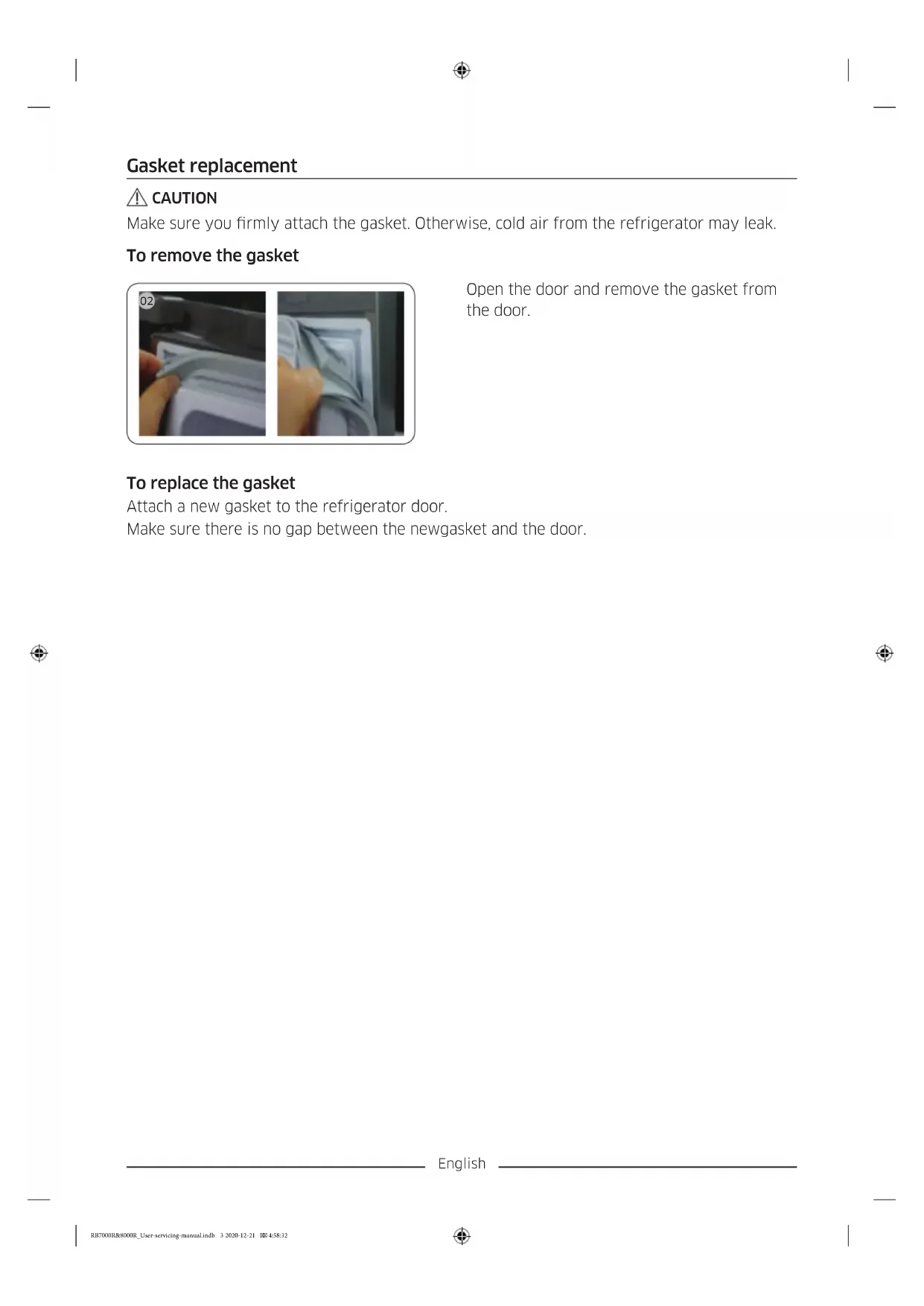 Open the door and remove the gasket from the door. To replace the gasket Attach a new gasket to the refrigerator door. Make sure there is no gap between the newgasket and the door. RB7000R&8000R_User-servicing-manual.indb 3 2020-12-21 4:58:32English Drawer replacement CAUTION Check that the drawer is inserted properly into the rail during assembly. To remove the drawer Pull the drawers out fully then slightly lift it up to remove the drawers.
