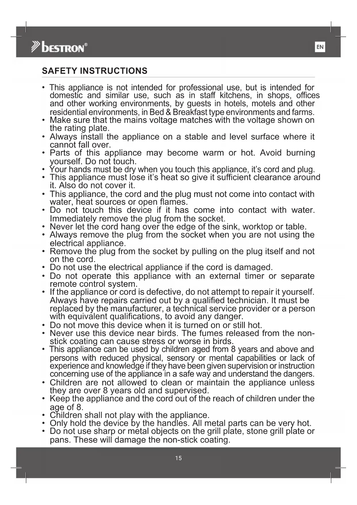 - Never use this device near birds. The fumes released from the non- stick coating can cause stress or worse in birds.