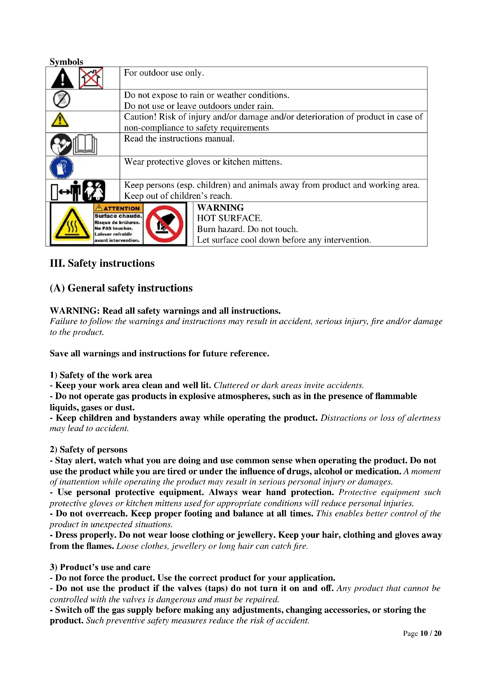 - Do not force the product. Use the correct product for your application. - Do not use the product if the valves (taps) do not turn it on and off. Any product that cannot be controlled with the valves is dangerous and must be repaired. - Switch off the gas supply before making any adjustments, changing accessories, or storing the product. Such preventive safety measures reduce the risk of accident.Page 11 / 20 - Store idle product out of the reach of children and do not allow persons unfamiliar with the product or these instructions to operate the product. Products are dangerous in the hands of untrained users. - Maintain product properly. Check for misalignment or binding of moving parts, breakage of parts and any other condition that may affect the product’s operation. If damaged, have the product repaired before use. Many accidents are caused by poorly maintained products. - Use the product in accordance with these instructions, taking into account the working conditions and the work to be performed. The use of the product for different operations may lead to dangerous situations.