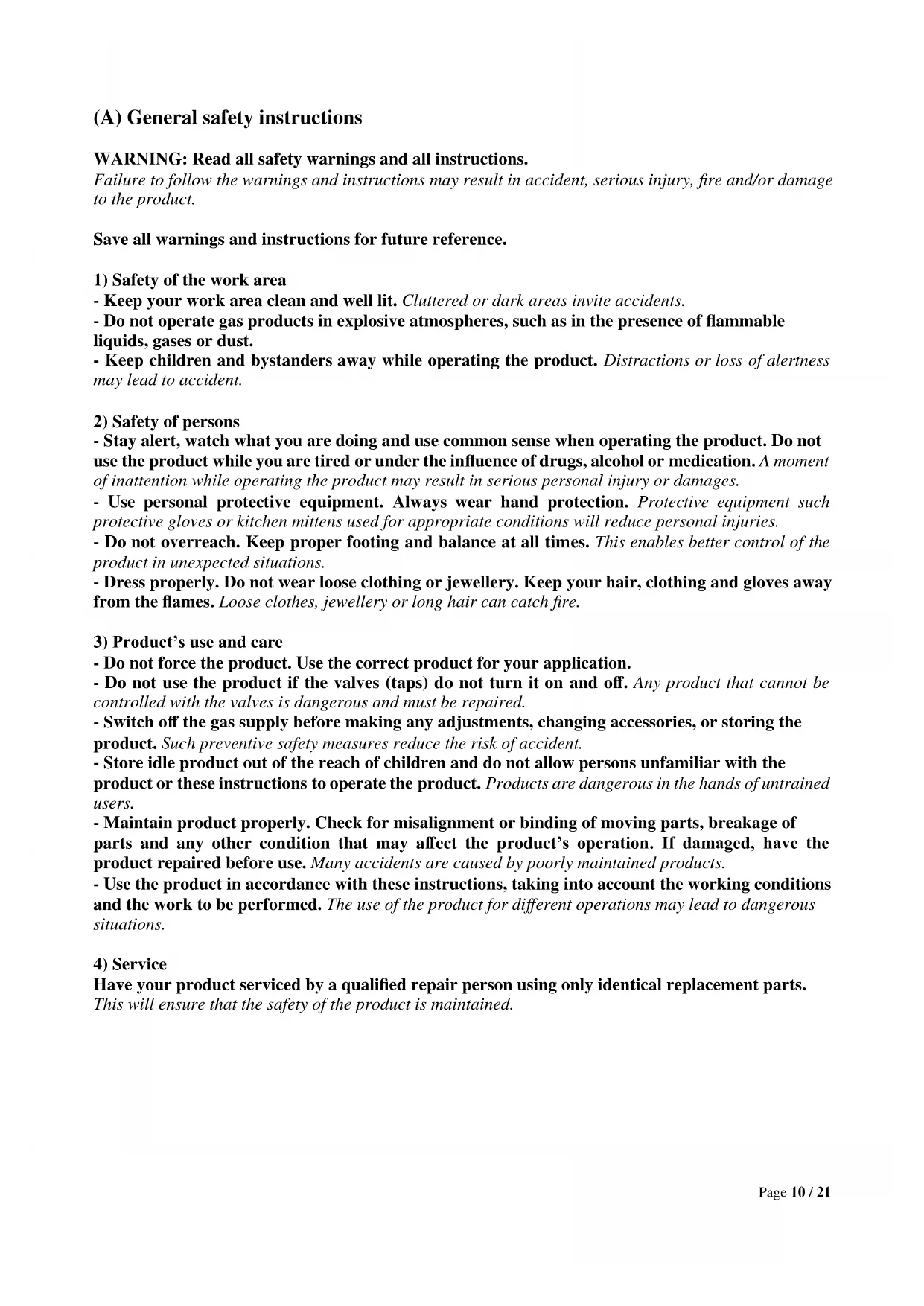 - Do not force the product. Use the correct product for your application. - Do not use the product if the valves (taps) do not turn it on and off. Any product that cannot be controlled with the valves is dangerous and must be repaired. - Switch off the gas supply before making any adjustments, changing accessories, or storing the product. Such preventive safety measures reduce the risk of accident. - Store idle product out of the reach of children and do not allow persons unfamiliar with the product or these instructions to operate the product. Products are dangerous in the hands of untrained users. - Maintain product properly. Check for misalignment or binding of moving parts, breakage of parts and any other condition that may affect the product’s operation. If damaged, have the product repaired before use. Many accidents are caused by poorly maintained products. - Use the product in accordance with these instructions, taking into account the working conditions and the work to be performed. The use of the product for different operations may lead to dangerous situations.