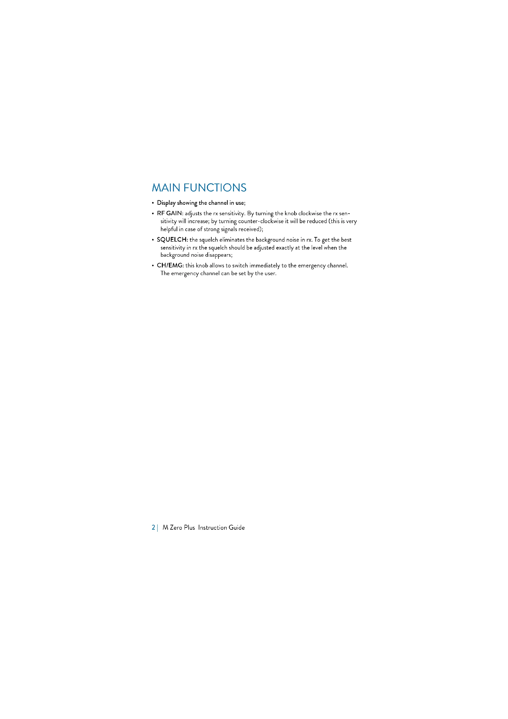 - CH/EMG: this knob allows to switch immediately to the emergency channel. The emergency channel can be set by the user.M Zero Plus Instruction Guide | 3