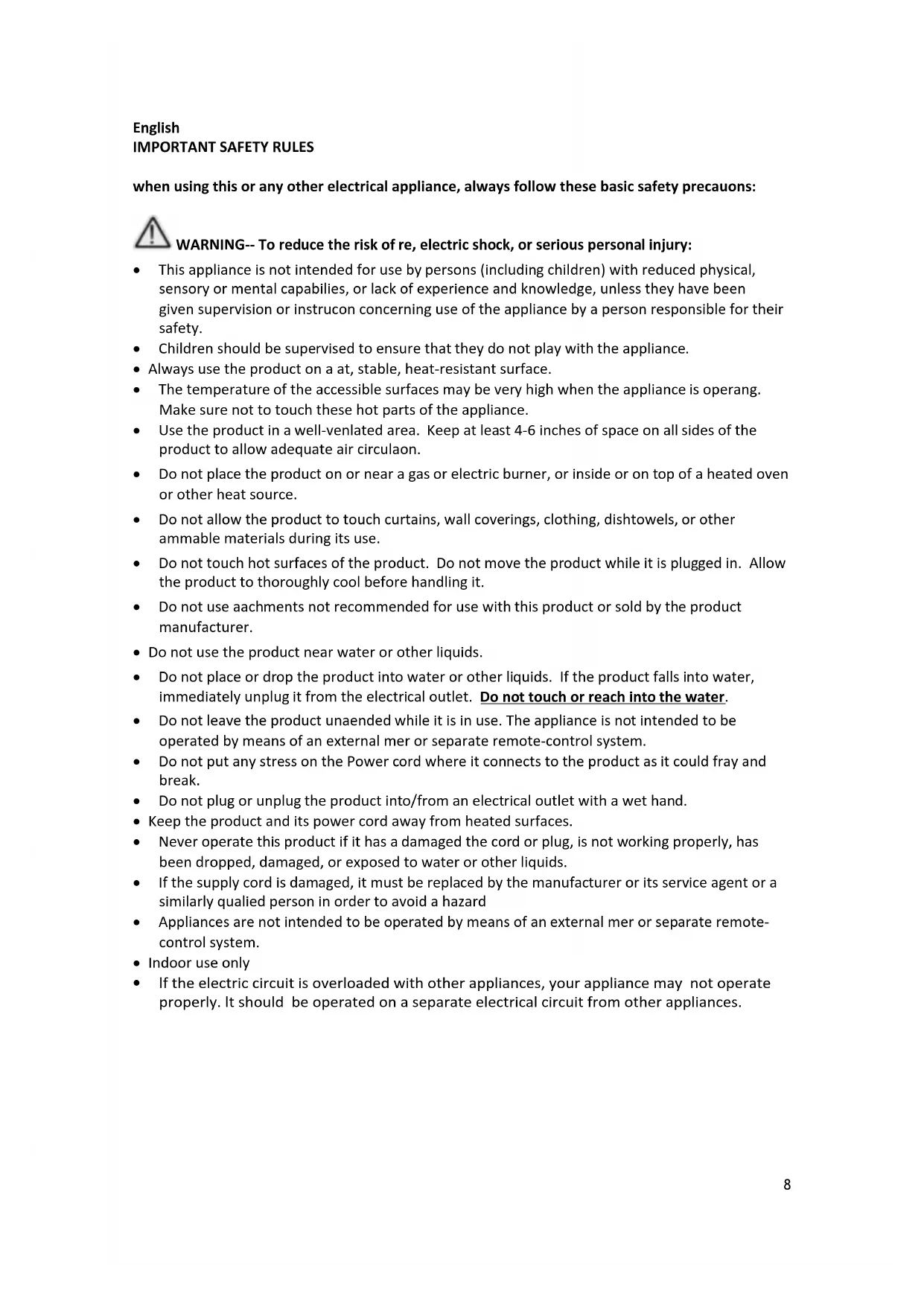 when using this or any other electrical appliance, always follow these basic safety precautions: WARNING-- To reduce the risk of fire, electric shock, or serious personal injury: This appliance is not intended for use by persons (including children) with reduced physical, sensory or mental capabilities, or lack of experience and knowledge, unless they have been given supervision or instruction concerning use of the appliance by a person responsible for their safety. Children should be supervised to ensure that they do not play with the appliance. Always use the product on a flat, stable, heat-resistant surface. The temperature of the accessible surfaces may be very high when the appliance is operating. Make sure not to touch these hot parts of the appliance. Use the product in a well-ventilated area. Keep at least 4-6 inches of space on all sides of the product to allow adequate air circulation. Do not place the product on or near a gas or electric burner, or inside or on top of a heated oven or other heat source. Do not allow the product to touch curtains, wall coverings, clothing, dishtowels, or other flammable materials during its use. Do not touch hot surfaces of the product. Do not move the product while it is plugged in. Allow the product to thoroughly cool before handling it. Do not use attachments not recommended for use with this product or sold by the product manufacturer. Do not use the product near water or other liquids. Do not place or drop the product into water or other liquids. If the product falls into water, immediately unplug it from the electrical outlet. Do not touch or reach into the water. Do not leave the product unattended while it is in use. The appliance is not intended to be operated by means of an external timer or separate remote-control system. Do not put any stress on the Power cord where it connects to the product as it could fray and break. Do not plug or unplug the product into/from an electrical outlet with a wet hand. Keep the product and its power cord away from heated surfaces. Never operate this product if it has a damaged the cord or plug, is not working properly, has been dropped, damaged, or exposed to water or other liquids. If the supply cord is damaged, it must be replaced by the manufacturer or its service agent or a similarly qualified person in order to avoid a hazard Appliances are not intended to be operated by means of an external timer or separate remote- control system. Indoor use only