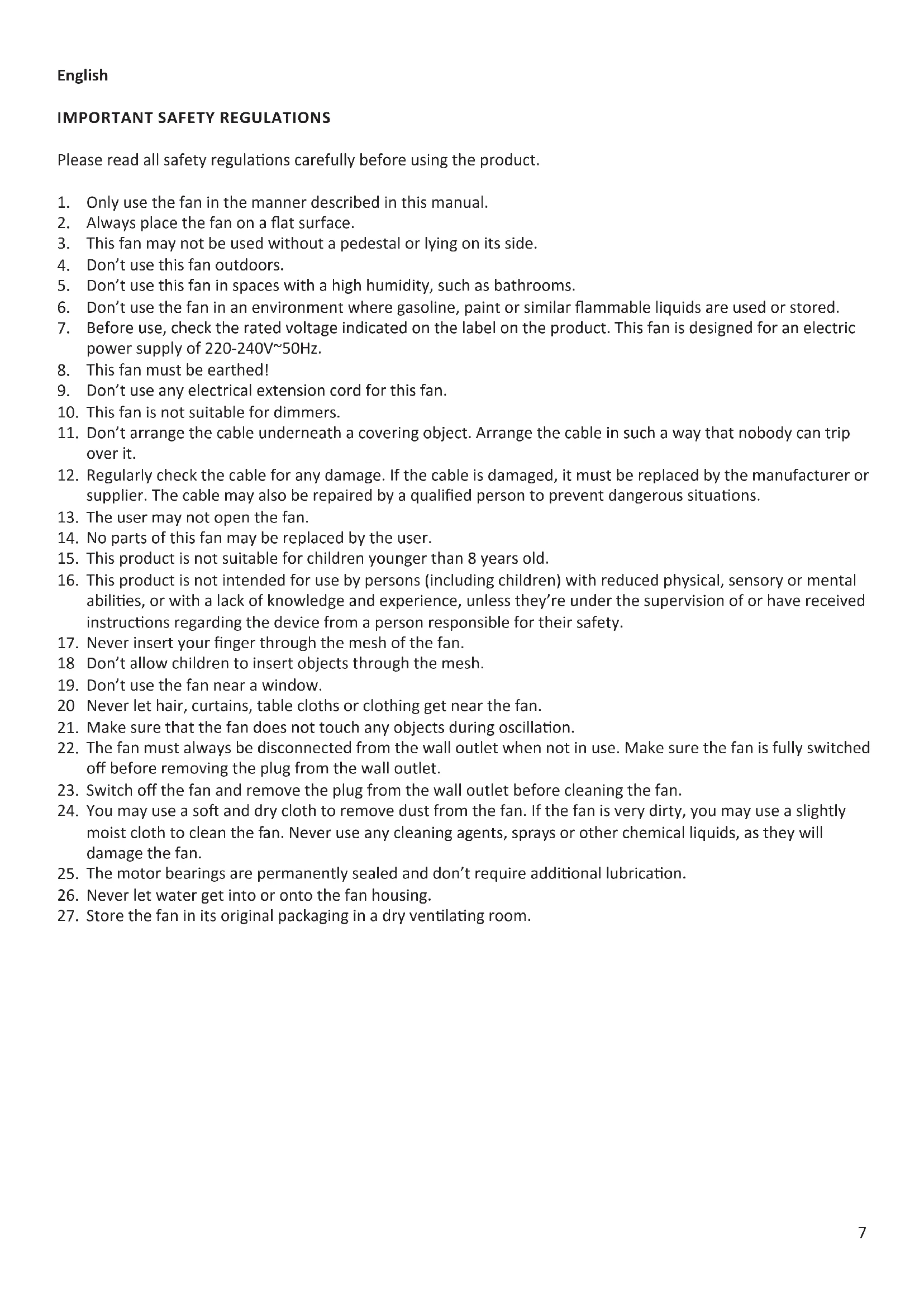 Only use the fan in the manner described in this manual. Always place the fan on a at surface. This fan may not be used without a pedestal or lying on its side. Don’t use this fan outdoors. Don’t use this fan in spaces with a high humidity, such as bathrooms. Don’t use the fan in an environment where gasoline, paint or similar ammable liquids are used or stored. Before use, check the rated voltage indicated on the label on the product. This fan is designed for an electric power supply of 220-240V~50Hz. This fan must be earthed! Don’t use any electrical extension cord for this fan. This fan is not suitable for dimmers. Don’t arrange the cable underneath a covering object. Arrange the cable in such a way that nobody can trip over it. Regularly check the cable for any damage. If the cable is damaged, it must be replaced by the manufacturer or supplier. The cable may also be repaired by a qualied person to prevent dangerous situaons. The user may not open the fan. No parts of this fan may be replaced by the user. This product is not suitable for children younger than 8 years old. This product is not intended for use by persons (including children) with reduced physical, sensory or mental abilies, or with a lack of knowledge and experience, unless they’re under the supervision of or have received instrucons regarding the device from a person responsible for their safety. Never insert your nger through the mesh of the fan. Don’t allow children to insert objects through the mesh. Don’t use the fan near a window. Never let hair, curtains, table cloths or clothing get near the fan. Make sure that the fan does not touch any objects during oscillaon. The fan must always be disconnected from the wall outlet when not in use. Make sure the fan is fully switched o before removing the plug from the wall outlet. Switch o the fan and remove the plug from the wall outlet before cleaning the fan. You may use a so and dry cloth to remove dust from the fan. If the fan is very dirty, you may use a slightly moist cloth to clean the fan. Never use any cleaning agents, sprays or other chemical liquids, as they will damage the fan. The motor bearings are permanently sealed and don’t require addional lubricaon. Never let water get into or onto the fan housing. Store the fan in its original packaging in a dry venlang room.FAN STRUCTURE