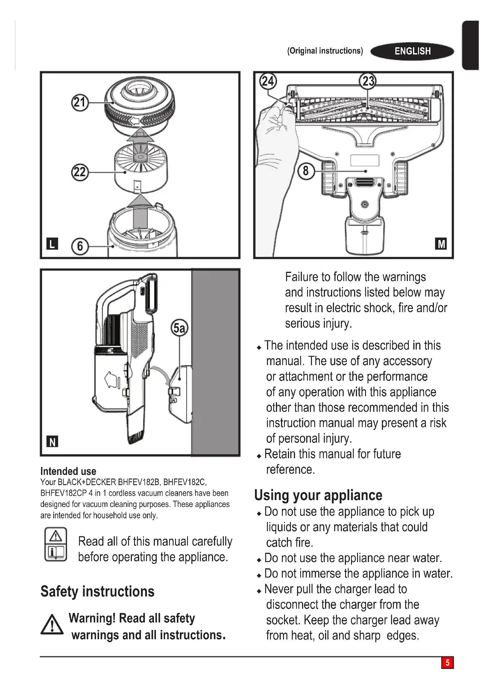Intended use Your BLACK+DECKER BHFEV182B, BHFEV182C, BHFEV182CP 4 in 1 cordless vacuum cleaners have been designed for vacuum cleaning purposes. These appliances are intended for household use only. Read all of this manual carefully before operating the appliance. Safety instructions