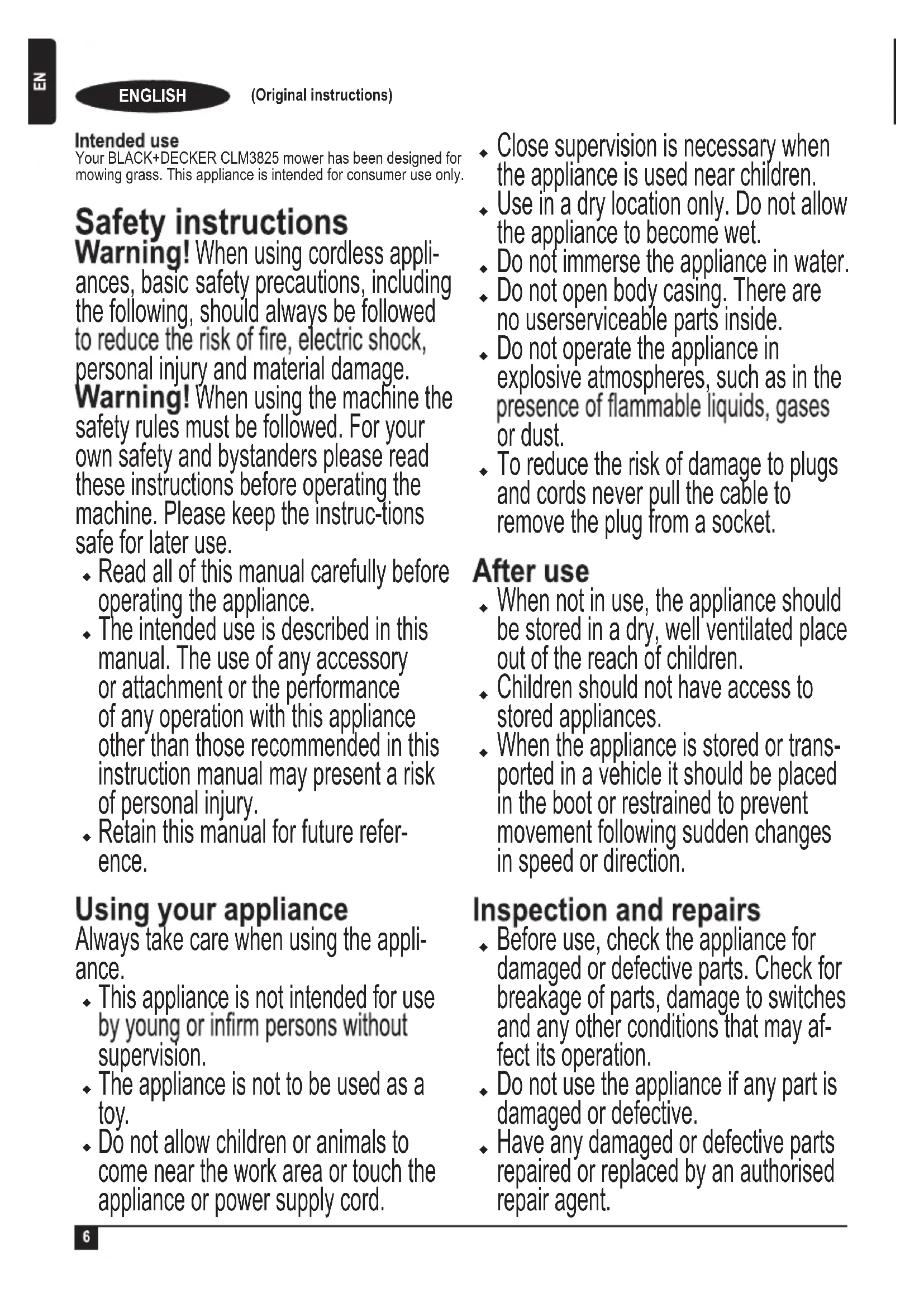 WYour BLACK+DECKER CLM3825 mower has been designed for mowing grass. This appliance is intended for consumer use only. When using cordless appli- ances, basic safety precautions, including the following, should always be followed personal injury and material damage. When using the machine the safety rules must be followed. For your own safety and bystanders please read these instructions before operating the machine. Please keep the instruc-tions safe for later use.
