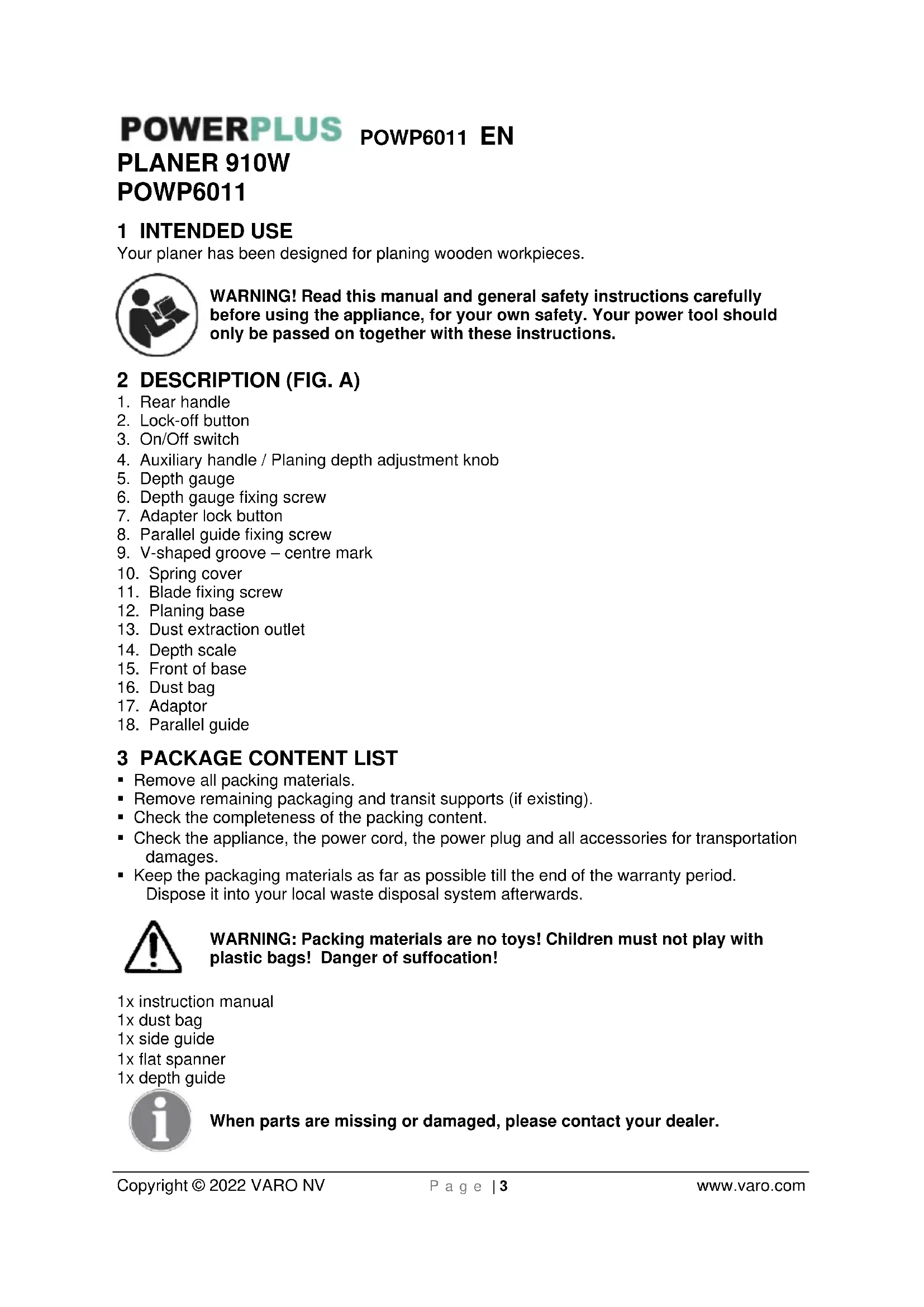 Copyright © 2022 VARO NV P a g e | 3 www.varo.com PLANER 910W POWP6011 1 INTENDED USE Your planer has been designed for planing wooden workpieces. WARNING! Read this manual and general safety instructions carefully before using the appliance, for your own safety. Your power tool should only be passed on together with these instructions. 2 DESCRIPTION (FIG. A)