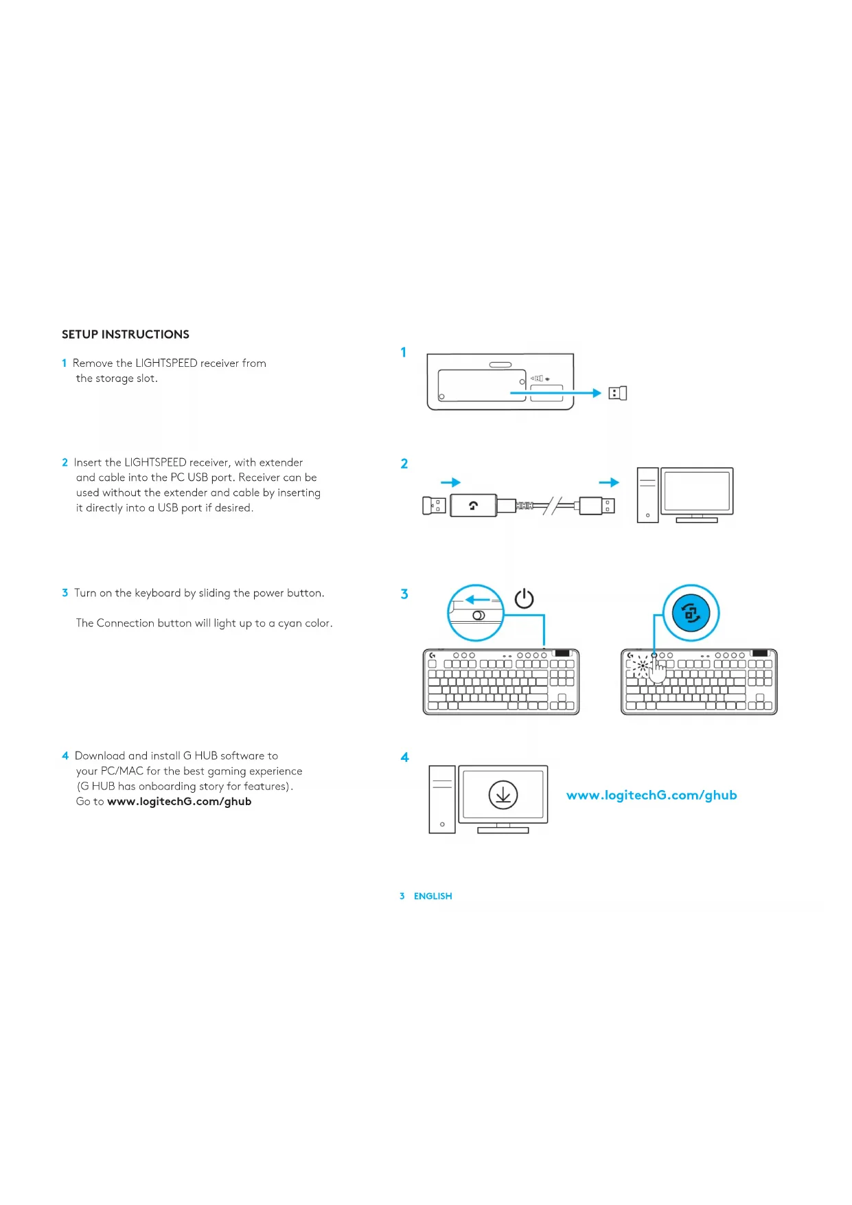 206 . . . . . . . . . . .3 ENGLISH SETUP INSTRUCTIONS 1 Remove the LIGHTSPEED receiver from thestorage slot. 2 Insert the LIGHTSPEED receiver, with extender and cable into the PC USB port. Receiver can be used without the extender and cable by inserting it directly into a USB port if desired. 3 Turn on the keyboard by sliding the power button. The Connection button will light up to a cyan color. 4 Download and install G HUB software to yourPC/MAC for the best gaming experience (G HUB has onboarding story for features). Gotowww.logitechG.com/ghub