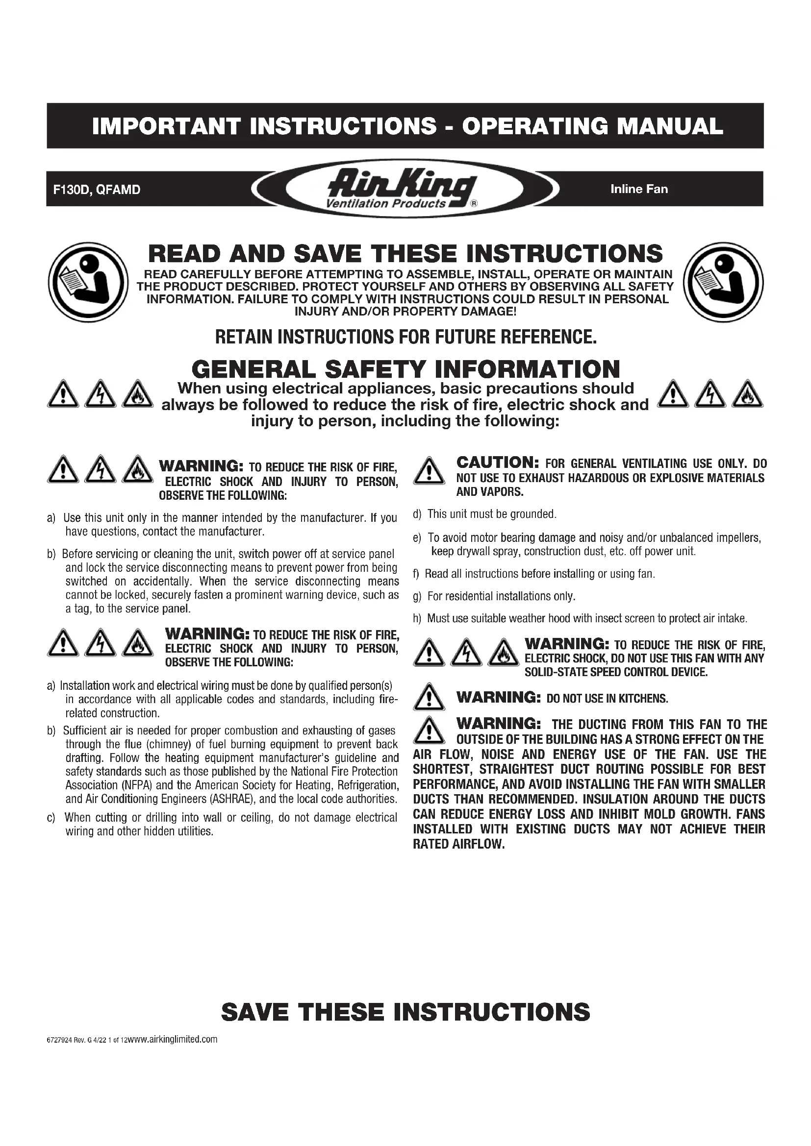 6727924 Rev. G 4/22 1 of 12www.airkinglimited.com CAUTION: FOR GENERAL VENTILATING USE ONLY. DO NOT USE TO EXHAUST HAZARDOUS OR EXPLOSIVE MATERIALS AND VAPORS.d) This unit must be grounded.e) To avoid motor bearing damage and noisy and/or unbalanced impellers, keep drywall spray, construction dust, etc. off power unit.f) Read all instructions before installing or using fan.g) For residential installations only.h) Must use suitable weather hood with insect screen to protect air intake.