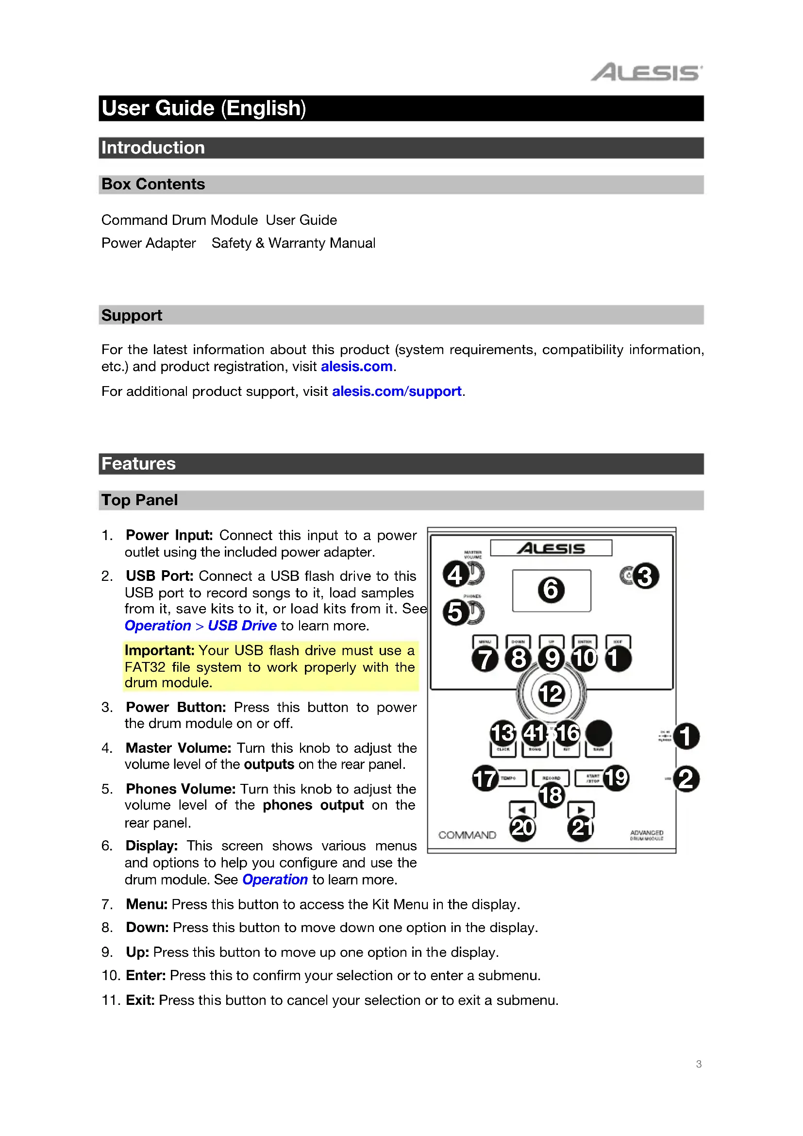 Support For the latest information about this product (system requirements, compatibility information, etc.) and product registration, visit alesis.com. For additional product support, visit alesis.com/support.