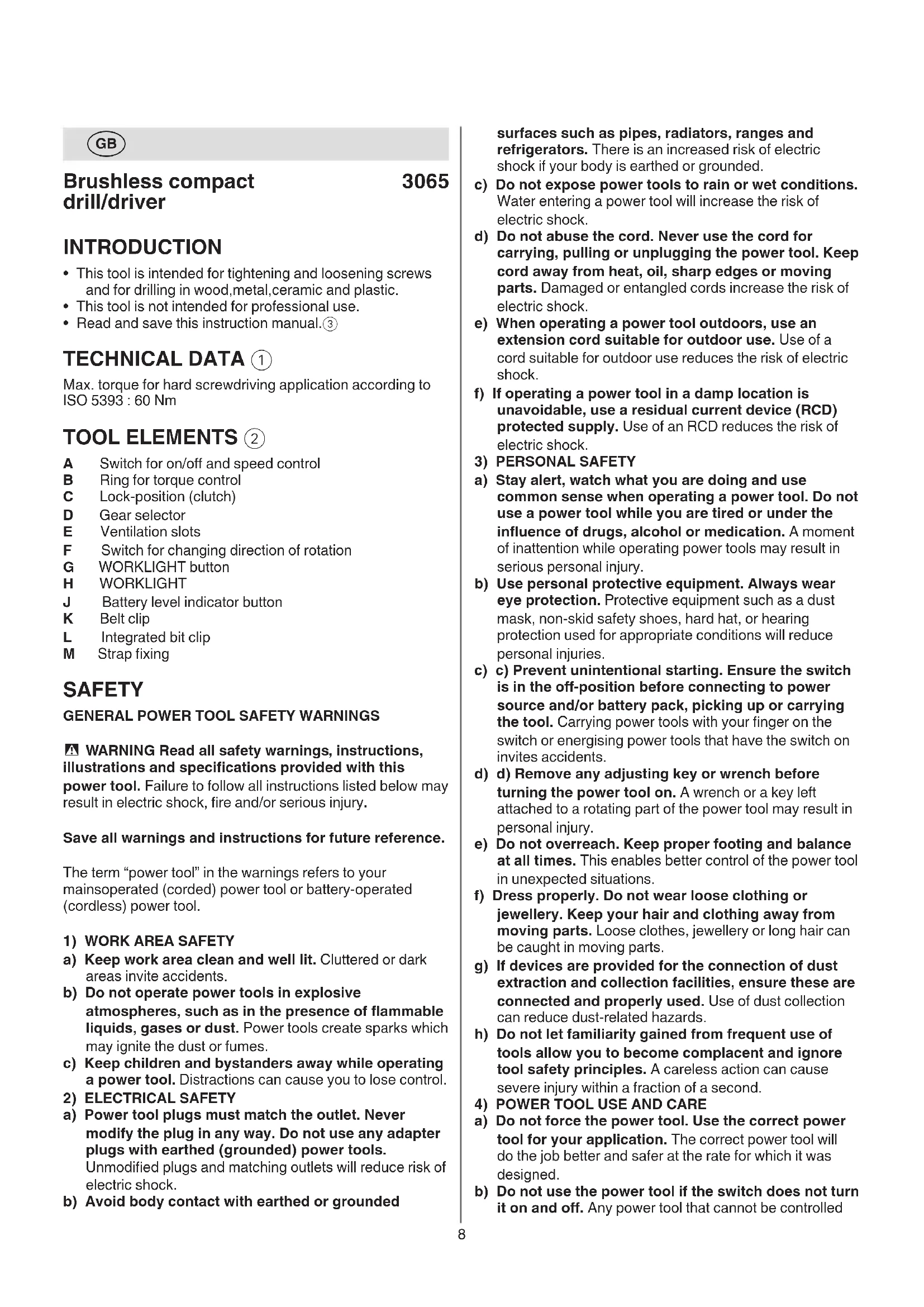 - Read and save this instruction manual.3 TECHNICAL DATA 1 Max. torque for hard screwdriving application according to ISO 5393 : 60 Nm TOOL ELEMENTS 2 A Switch for on/o and speed control B Ring for torque control C Lock-position (clutch) D Gear selector E Ventilation slots F Switch for changing direction of rotation G WORKLIGHT button H WORKLIGHT