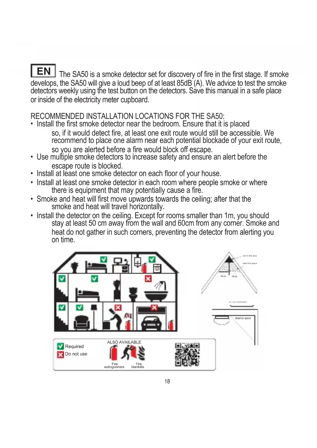 17EN The SA50 is a smoke detector set for discovery of re in the rst stage. If smoke develops, the SA50 will give a loud beep of at least 85dB (A). We advice to test the smoke detectors weekly using the test button on the detectors. Save this manual in a safe place or inside of the electricity meter cupboard. RECOMMENDED INSTALLATION LOCATIONS FOR THE SA50: