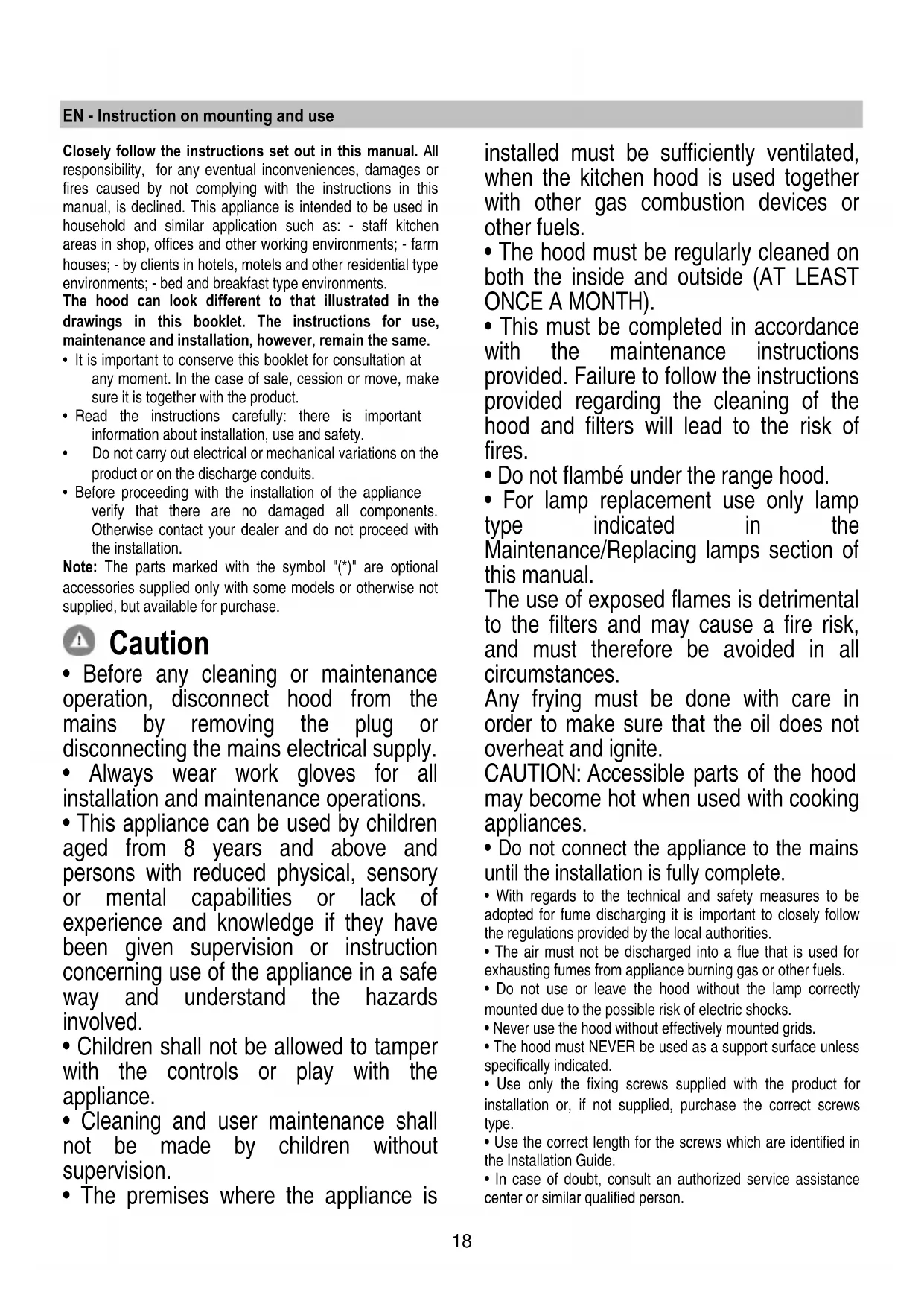 - Before any cleaning or maintenance operation, disconnect hood from the mains by removing the plug or disconnecting the mains electrical supply.