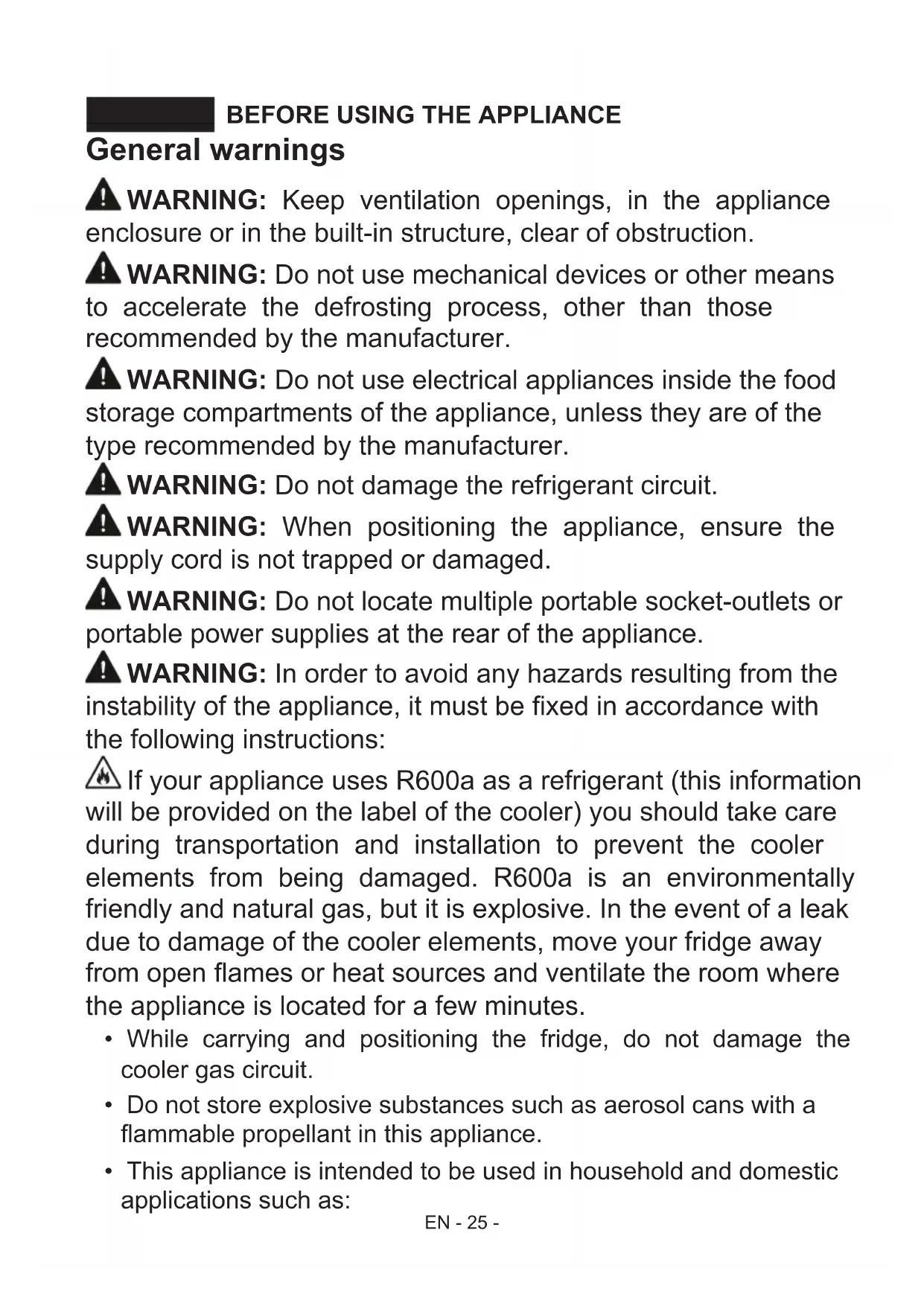 instability of the appliance, it must be xed in accordance with the following instructions: If your appliance uses R600a as a refrigerant (this information will be provided on the label of the cooler) you should take care during transportation and installation to prevent the cooler elements from being damaged. R600a is an environmentally friendly and natural gas, but it is explosive. In the event of a leak due to damage of the cooler elements, move your fridge away from open ames or heat sources and ventilate the room where the appliance is located for a few minutes.